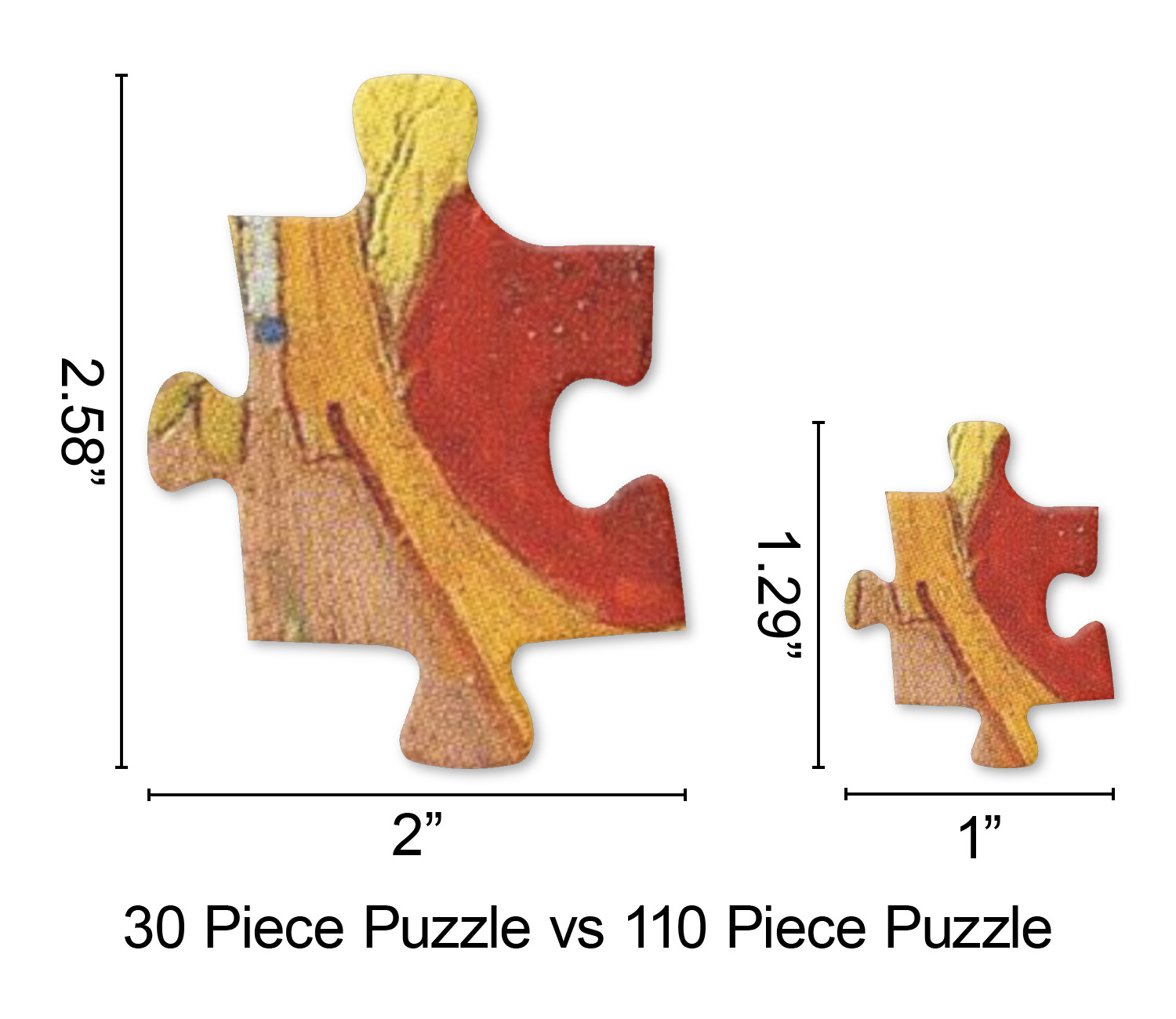 We print our puzzles on thick white chipboard in vibrant colors, then laminate the chipboard and die cut your puzzle. Your jigsaw puzzle is shipped to you in a box with the image of the puzzle on the box.