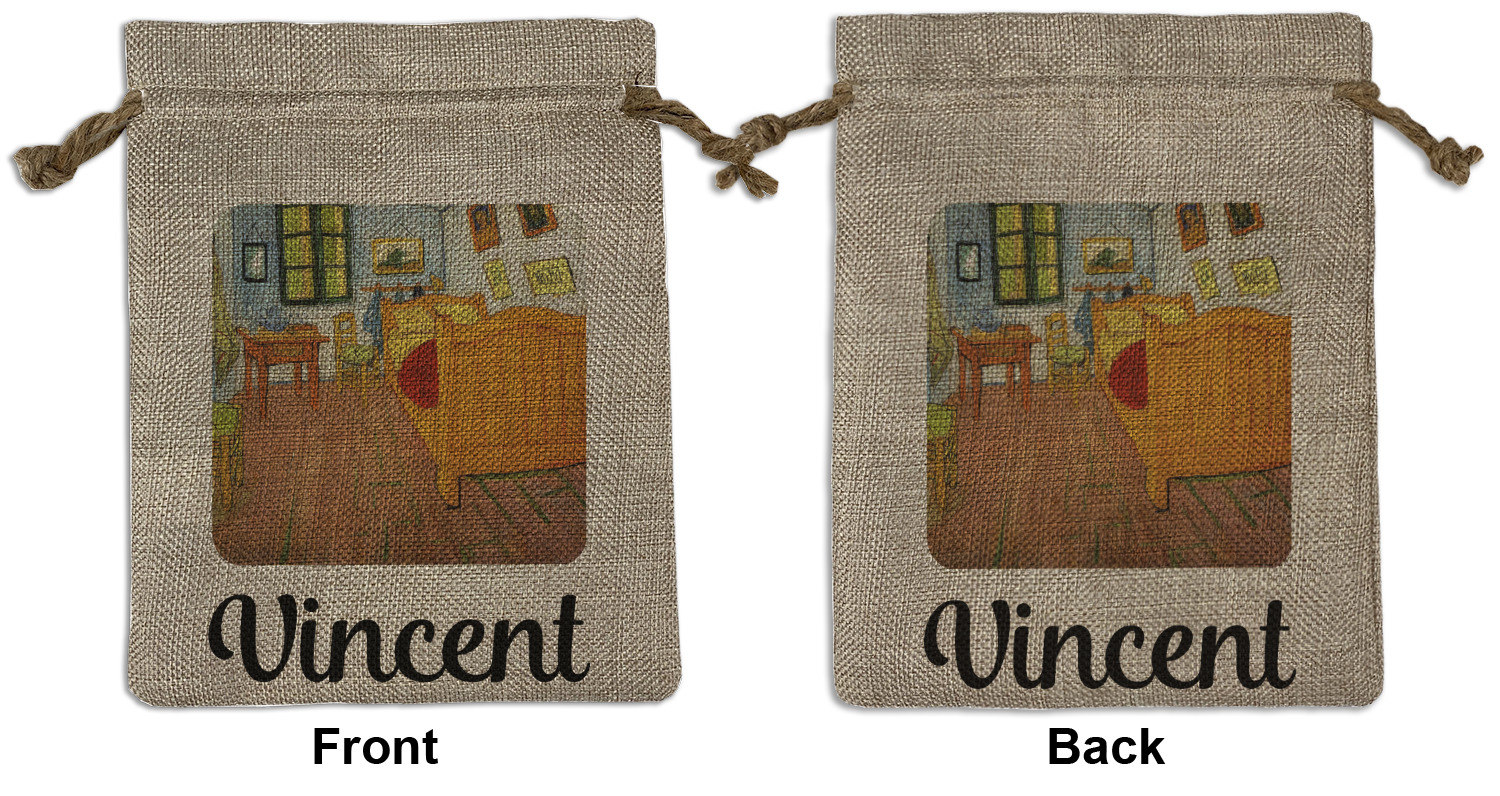 We sell our Burlap Gift Bags in 3 variant sized bags. Made with burlap polyester, each personalized bag can be secured with a twine drawstring pull. Your custom design is available to print on one side or both sides - completely up to you! The sizes of the bags measure approximately 4.5" x 6.5" for the smallest size, 6.5" x 8.0" for the medium size, and 6.5" x 13.5" for the large-sized bag.