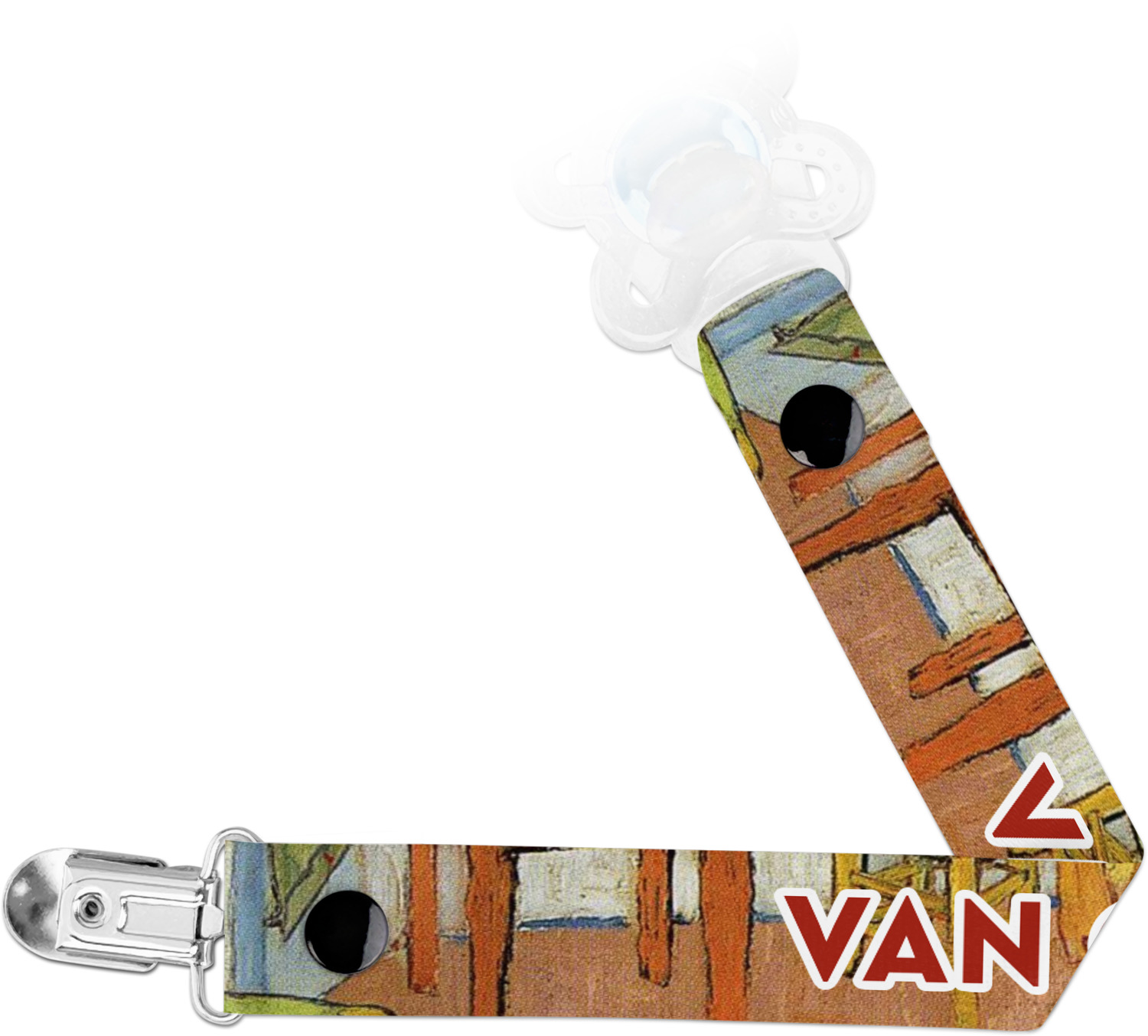 This personalized pacifier clip is the ideal size and measures at approximately 7.5 inches in length, when either end is snapped closed. On one end, you'll find a snap button. This button of your baby's pacifier holder is what can be attached to their pacifier to hold is securely in place. Simply open the snap, slip it through the pacifier opening, and snap it back into place. On the opposite end of this baby pacifier holder, you'll find a metal clip that can secure to a baby's collar or sleeve. This clip ensures that the strap stays in place, and that your baby's pacifier is always on hand.