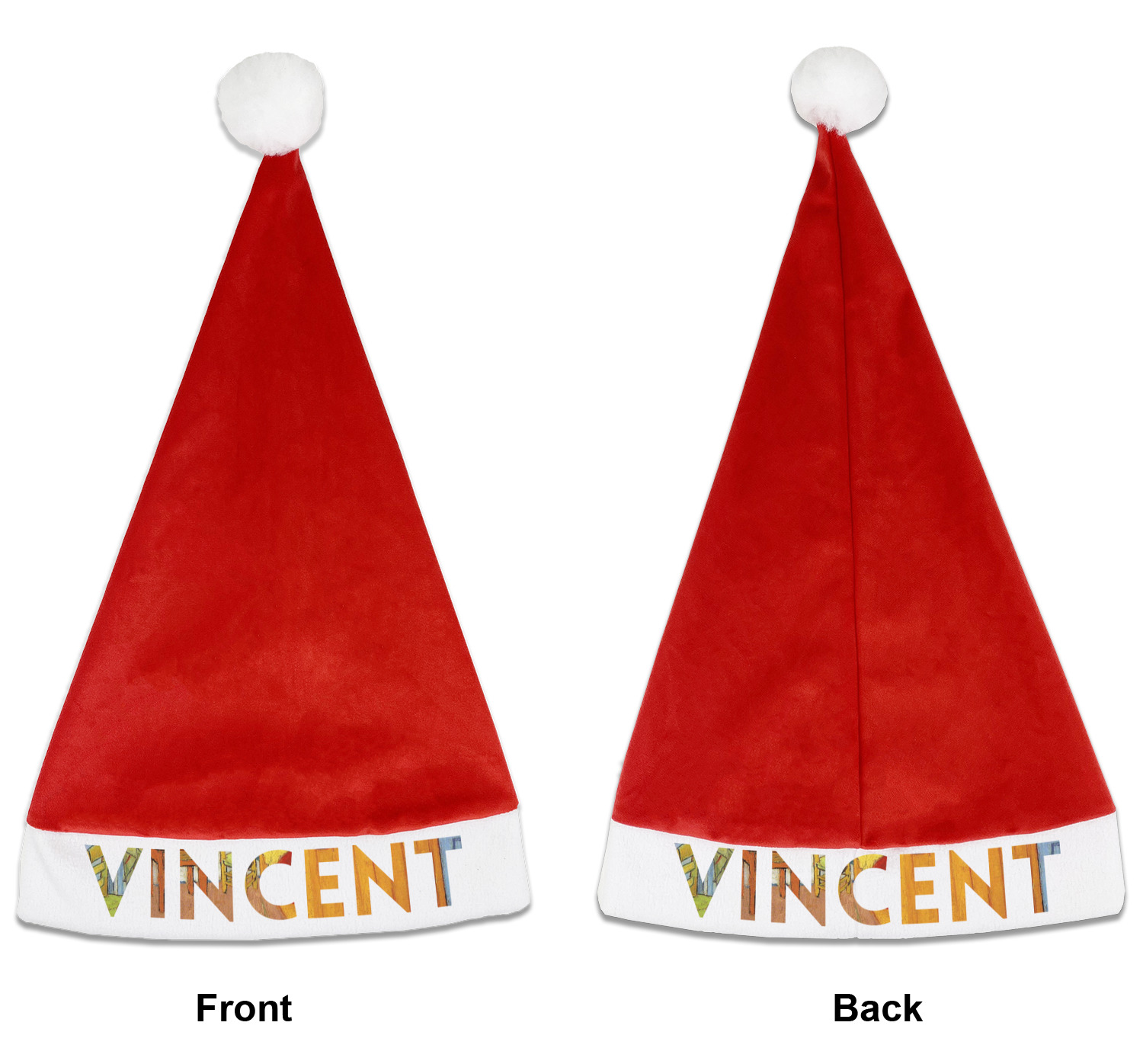 Our Santa hats are a soft, velvety polyester material. These customizable Santa hats are a classic red with white brimming and pom pom ball hanging off the hat tail just like Santa Claus! Each personalized Santa hat is approximately 17.5 L x 11.8 W. We offer two different styles to print your designs on the white brim - front or front & back.