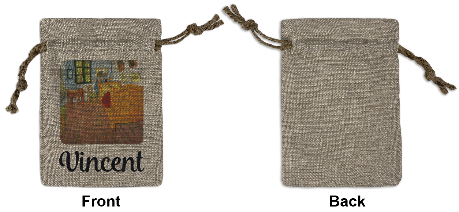 We sell our Burlap Gift Bags in 3 variant sized bags. Made with burlap polyester, each personalized bag can be secured with a twine drawstring pull. Your custom design is available to print on one side or both sides - completely up to you! The sizes of the bags measure approximately 4.5" x 6.5" for the smallest size, 6.5" x 8.0" for the medium size, and 6.5" x 13.5" for the large-sized bag.