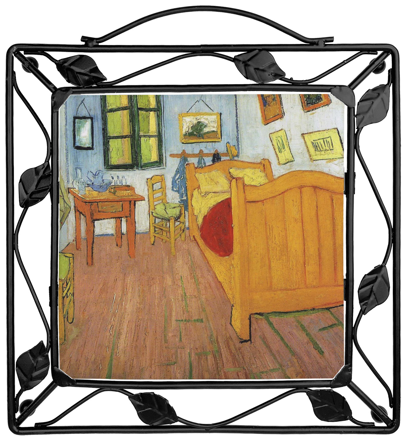 Our square trivets are made from a durable, wrought iron. This model features 4 small half circles, one on each corner, and a larger ring of iron that circles the central, customized tile. Each of the 4 corners has a round foot on its bottom for stability. This trivet is 8.75 by 8.75 inches, but the central tile measures at 6 inches on both sides.