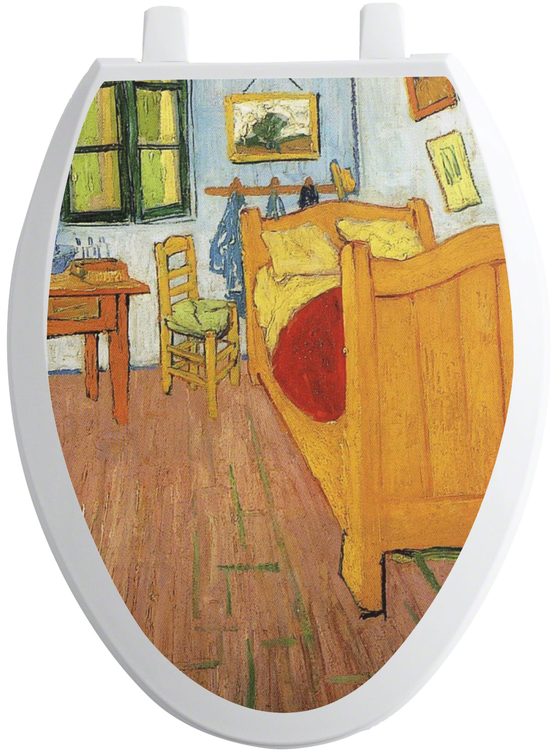 We sell these toilet lid decals in two different shapes to accommodate a wider range of toilet seat shapes. The first shape is our standard, round size, which measures at 13.5 by 12 inches. Our second option is an elongated shape, suited for long toilet seat covers. It measures 15 by 12 inches.