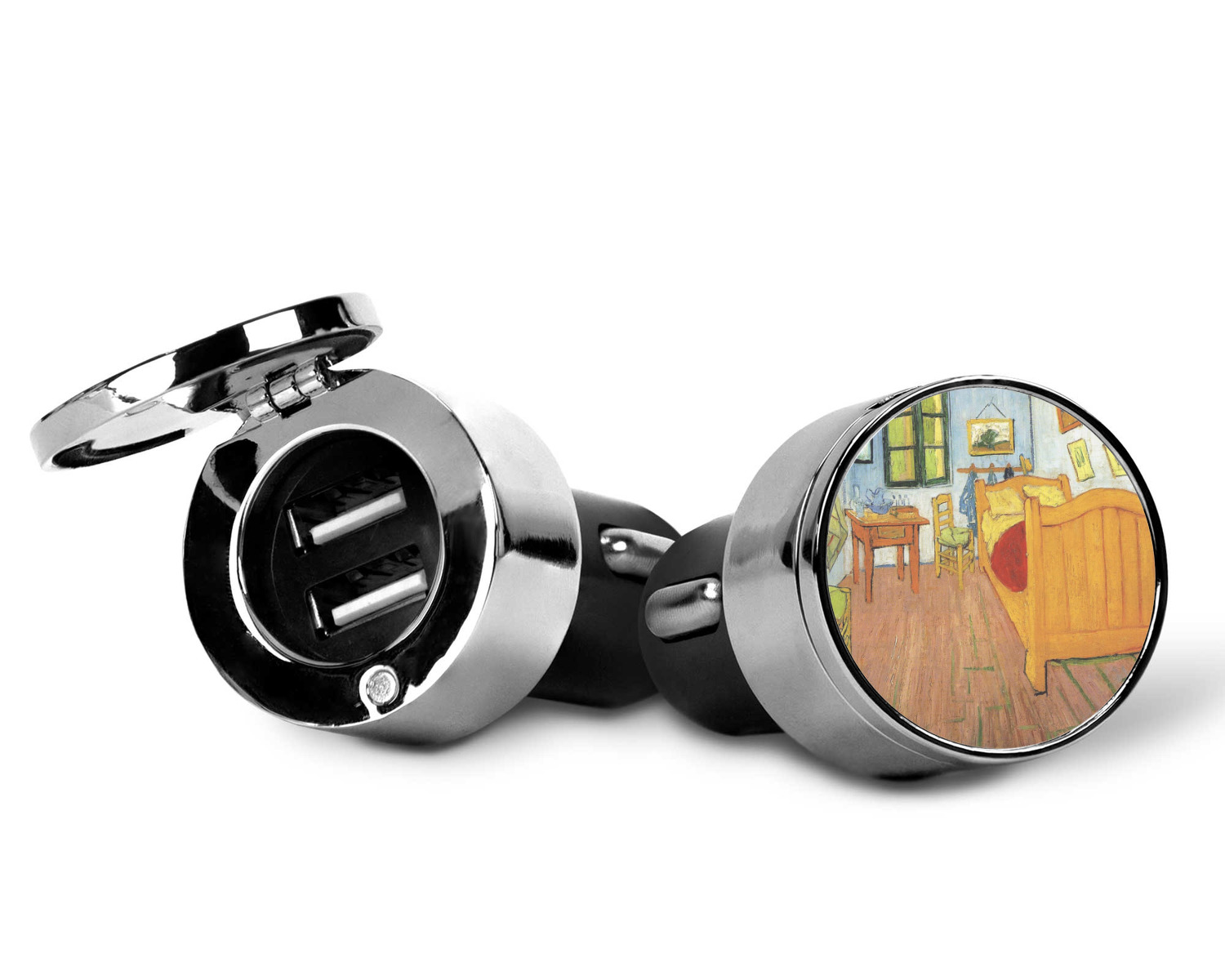 This car charger adapter converts your cars bland cigarette lighter into a decorative, personalized, and operational USB charging port. Made of solid, silver-plated metal, these chargers feature a flip-open lid that both displays your customized design and conceals two USB ports. The metal lid of the USB car charger adapter is 1.5" in diameter and seals due to a small, ingrained magnet on both the charger and its lid. The cigarette lighter insert, itself, is colored black.