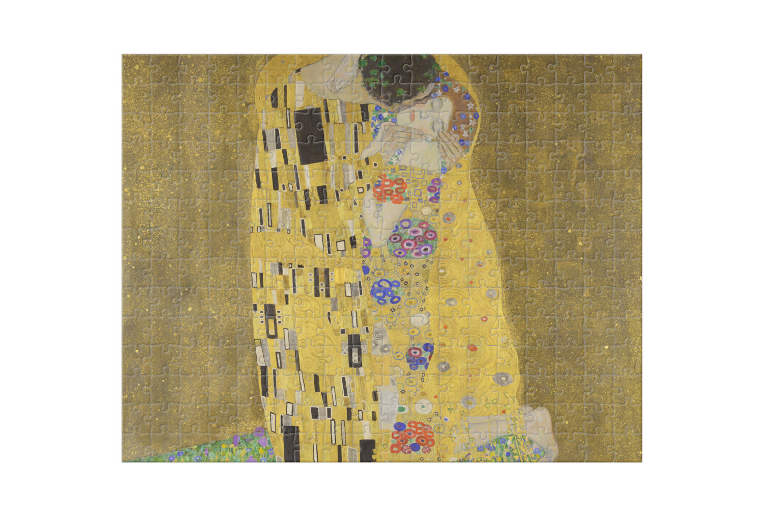 The Kiss (Lovers) was painted by the Austrian Symbolist painter Gustav Klimt between 1907 and 1908, the high-point of his "Golden Period", when he painted a number of works in a similar gilded style. A perfect square, the canvas depicts a couple embracing, their bodies entwined in elaborate robes decorated in a style influenced by both linear constructs of the contemporary Art Nouveau style and the organic forms of the earlier Arts and Crafts movement. The work is composed of oil paint with applied layers of gold leaf, an aspect that gives it its strikingly modern, yet evocative appearance. It is a symbol of Viennese Art Nouveau and is considered Klimt's most popular work.(source: Wikipedia)