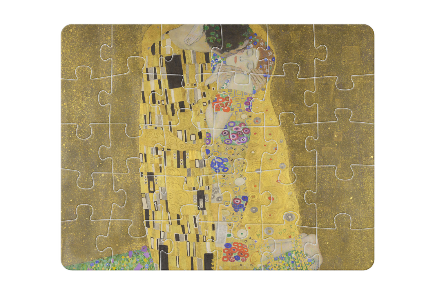 The Kiss (Lovers) was painted by the Austrian Symbolist painter Gustav Klimt between 1907 and 1908, the high-point of his "Golden Period", when he painted a number of works in a similar gilded style. A perfect square, the canvas depicts a couple embracing, their bodies entwined in elaborate robes decorated in a style influenced by both linear constructs of the contemporary Art Nouveau style and the organic forms of the earlier Arts and Crafts movement. The work is composed of oil paint with applied layers of gold leaf, an aspect that gives it its strikingly modern, yet evocative appearance. It is a symbol of Viennese Art Nouveau and is considered Klimt's most popular work.(source: Wikipedia)