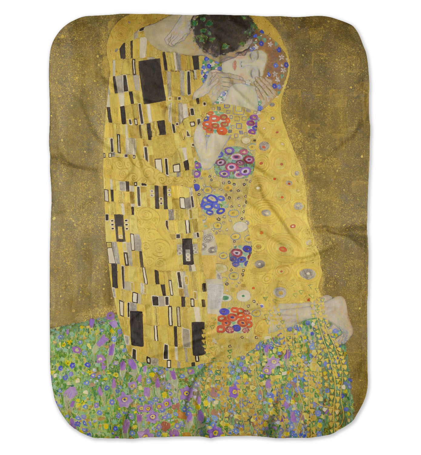 Now you can enjoy this beautiful art on a daily basis. Well not all of it! To put The Kiss (a square) on products, we use as much of the painting as we can on each product. So for a square product like the shower curtain - we use the entire square; however, for other products such as the wristlet (a wide 4x1 rectangle) - you get a small slice of the painting and we use the focal point - which in this case is The Kiss!