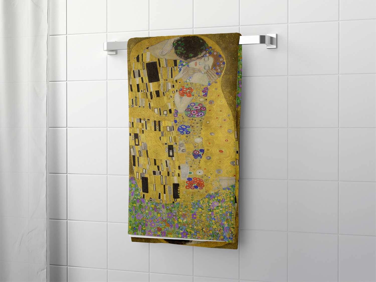 Now you can enjoy this beautiful art on a daily basis. Well not all of it! To put The Kiss (a square) on products, we use as much of the painting as we can on each product. So for a square product like the shower curtain - we use the entire square; however, for other products such as the wristlet (a wide 4x1 rectangle) - you get a small slice of the painting and we use the focal point - which in this case is The Kiss!