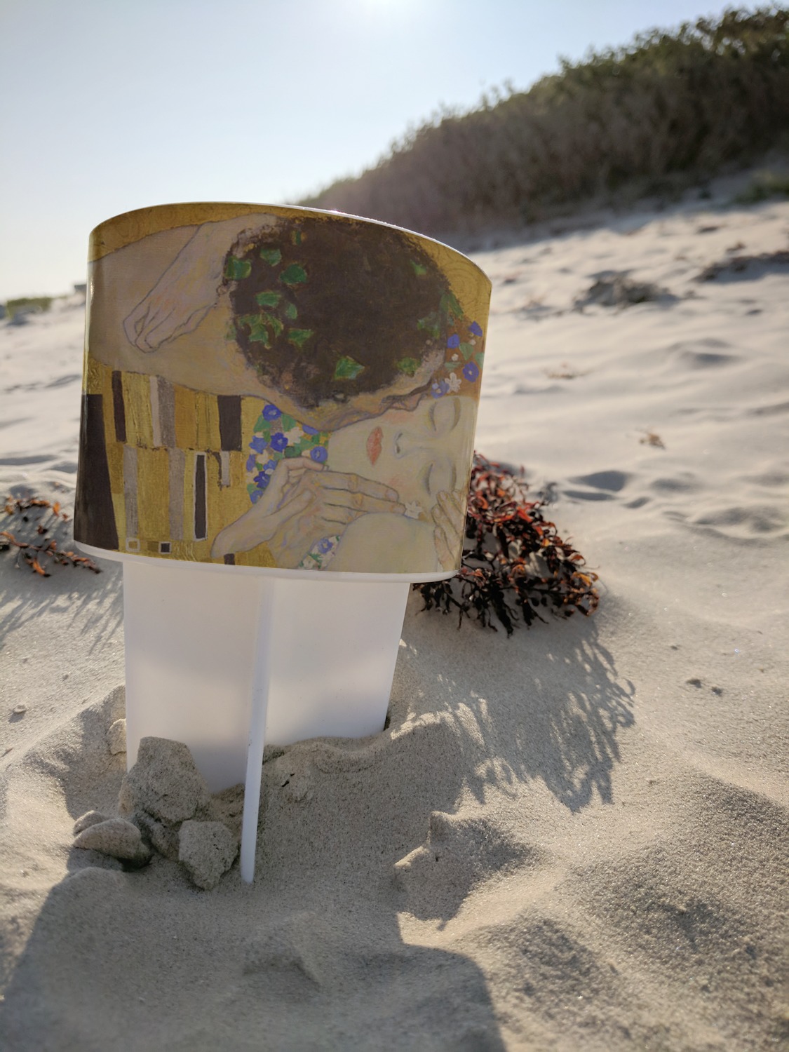 Now you can enjoy this beautiful art on a daily basis. Well not all of it! To put The Kiss (a square) on products, we use as much of the painting as we can on each product. So for a square product like the shower curtain - we use the entire square; however, for other products such as the wristlet (a wide 4x1 rectangle) - you get a small slice of the painting and we use the focal point - which in this case is The Kiss!