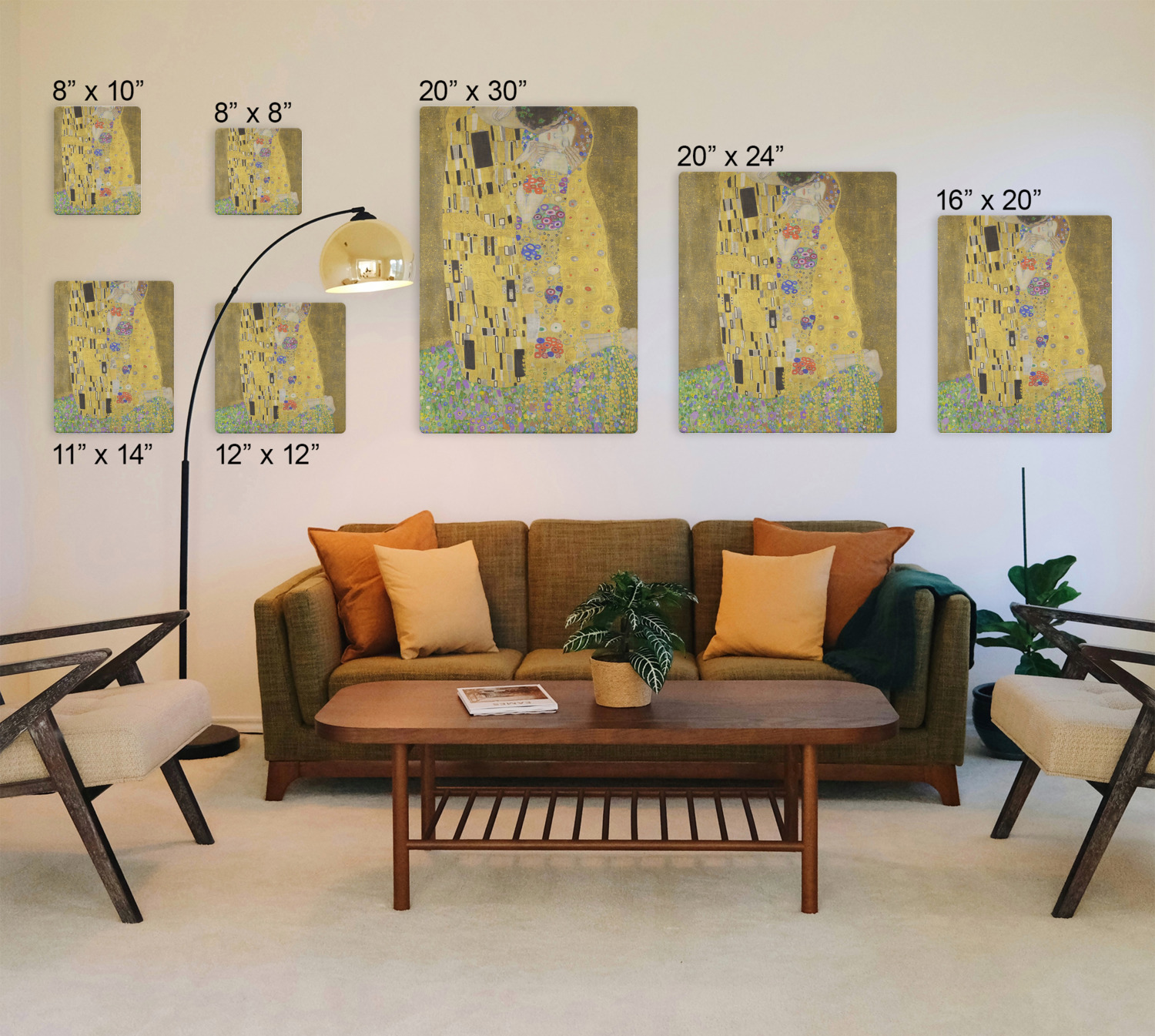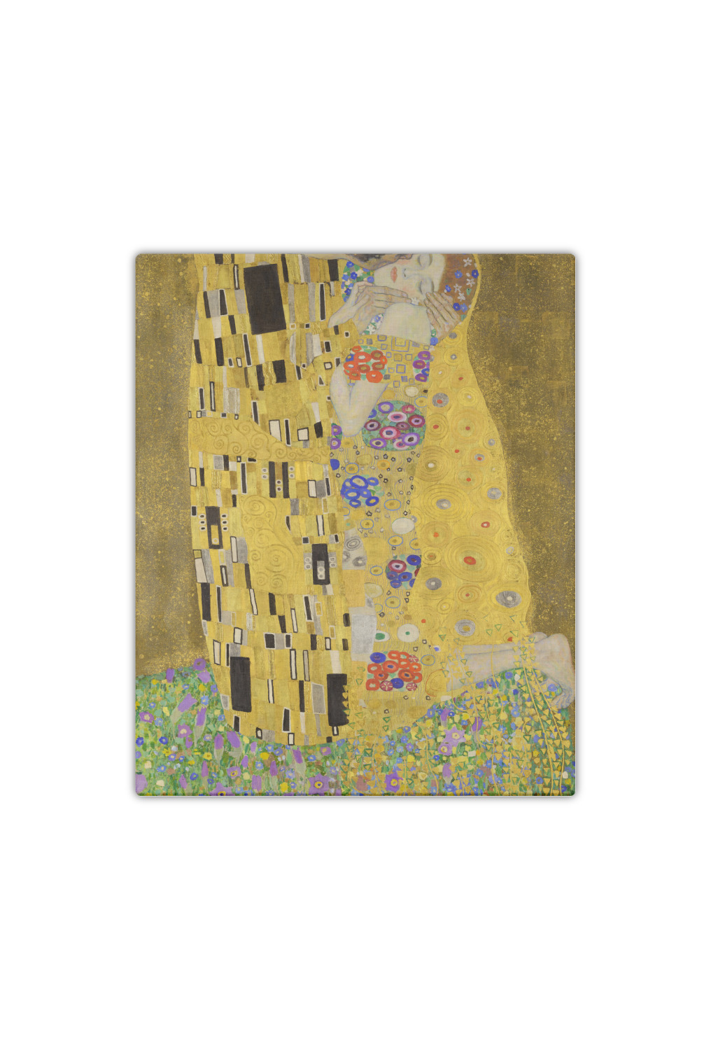 The Kiss (Lovers) was painted by the Austrian Symbolist painter Gustav Klimt between 1907 and 1908, the high-point of his "Golden Period", when he painted a number of works in a similar gilded style. A perfect square, the canvas depicts a couple embracing, their bodies entwined in elaborate robes decorated in a style influenced by both linear constructs of the contemporary Art Nouveau style and the organic forms of the earlier Arts and Crafts movement. The work is composed of oil paint with applied layers of gold leaf, an aspect that gives it its strikingly modern, yet evocative appearance. It is a symbol of Viennese Art Nouveau and is considered Klimt's most popular work.(source: Wikipedia)