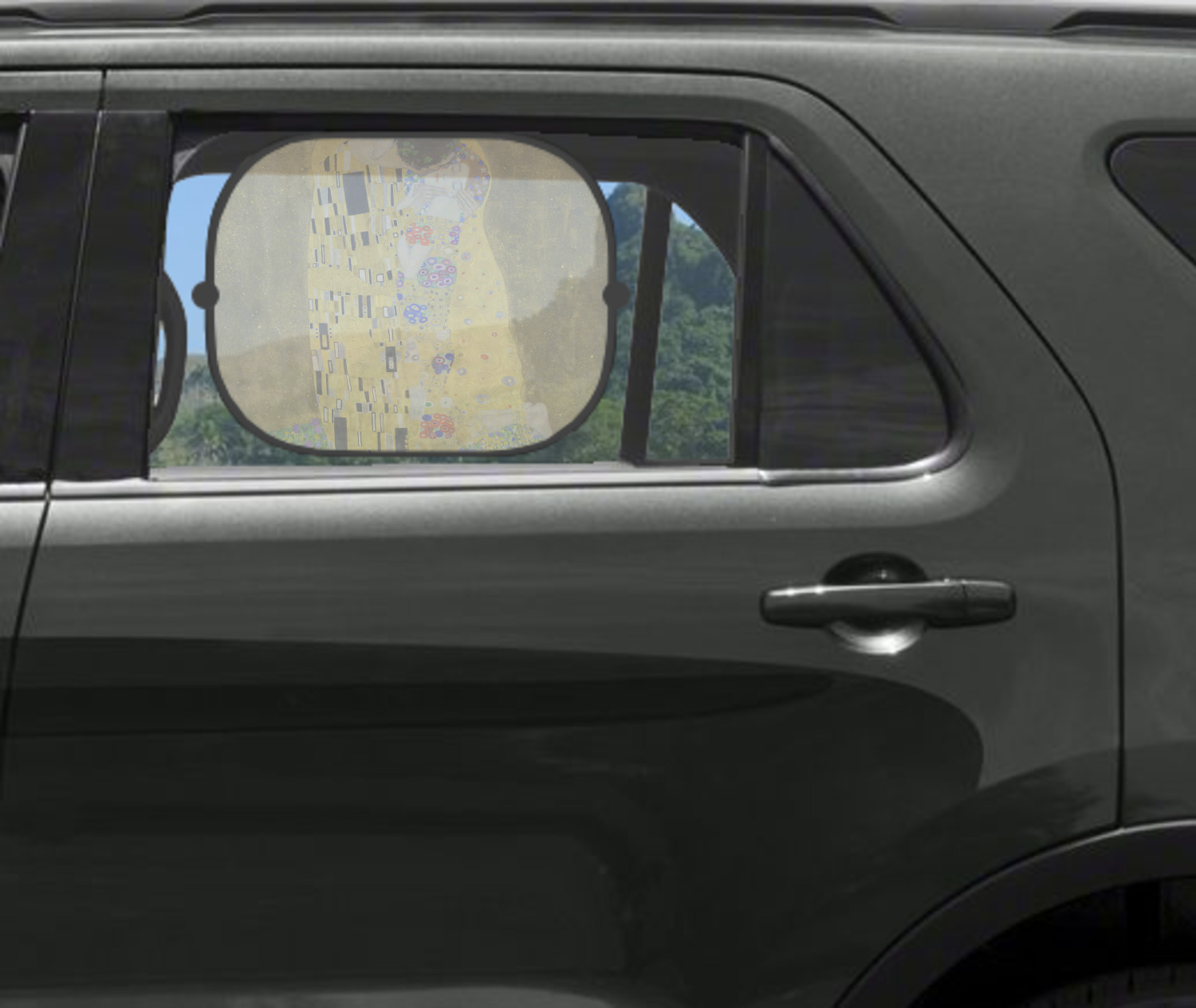 Our custom car sun shade is fabricated from a polyester netting that manages to block out most harsh rays, while still allowing some light to come through. A metal ring encircles the polyester netting, which grants durability and stiffness to the shade. We print your personalized design on the entire surface of the product. Two black suction cups accompany this product; the pair clip onto either side of the shade and allows for easy attachment and removal. Each shade measures at 17.25" x 14.25". We suggest that you measure the side windows of your car to ensure that this car window shade is a proper fit.