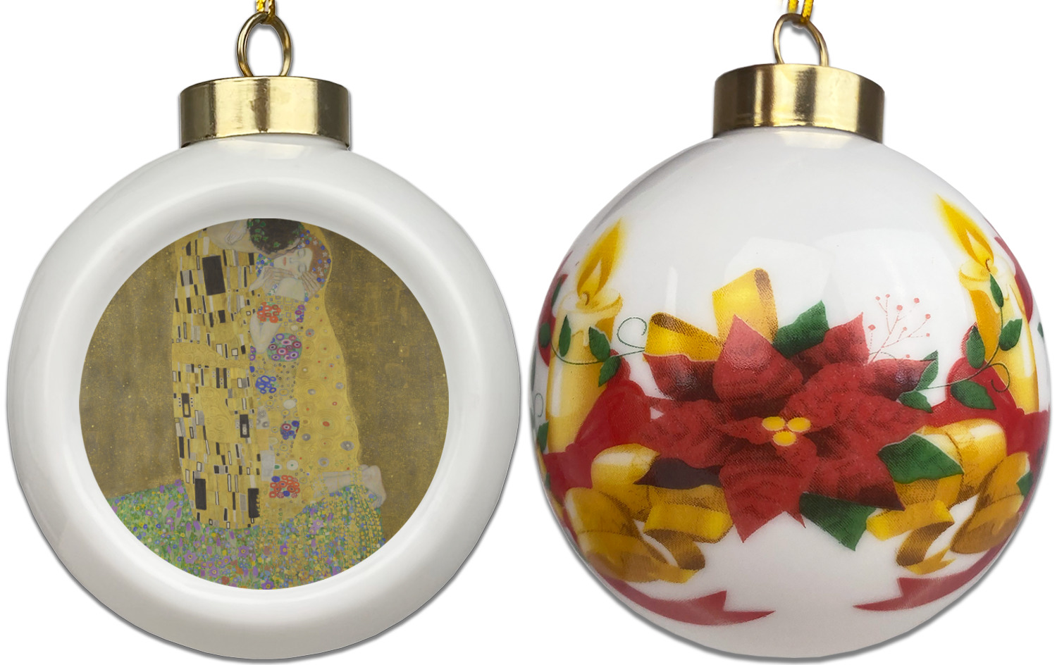Our Christmas ornaments are a unique ceramic ball shape with a twist as it has a flat face to display your custom design! Select from one of our two design types - Christmas Tree or Poinsettia Garland - to adorn the curved back of your personal design. Each ornament measures 3H x 2.5W x 2D accompanied with a gold string accent for finishing touches to hang on your beautiful Christmas tree!