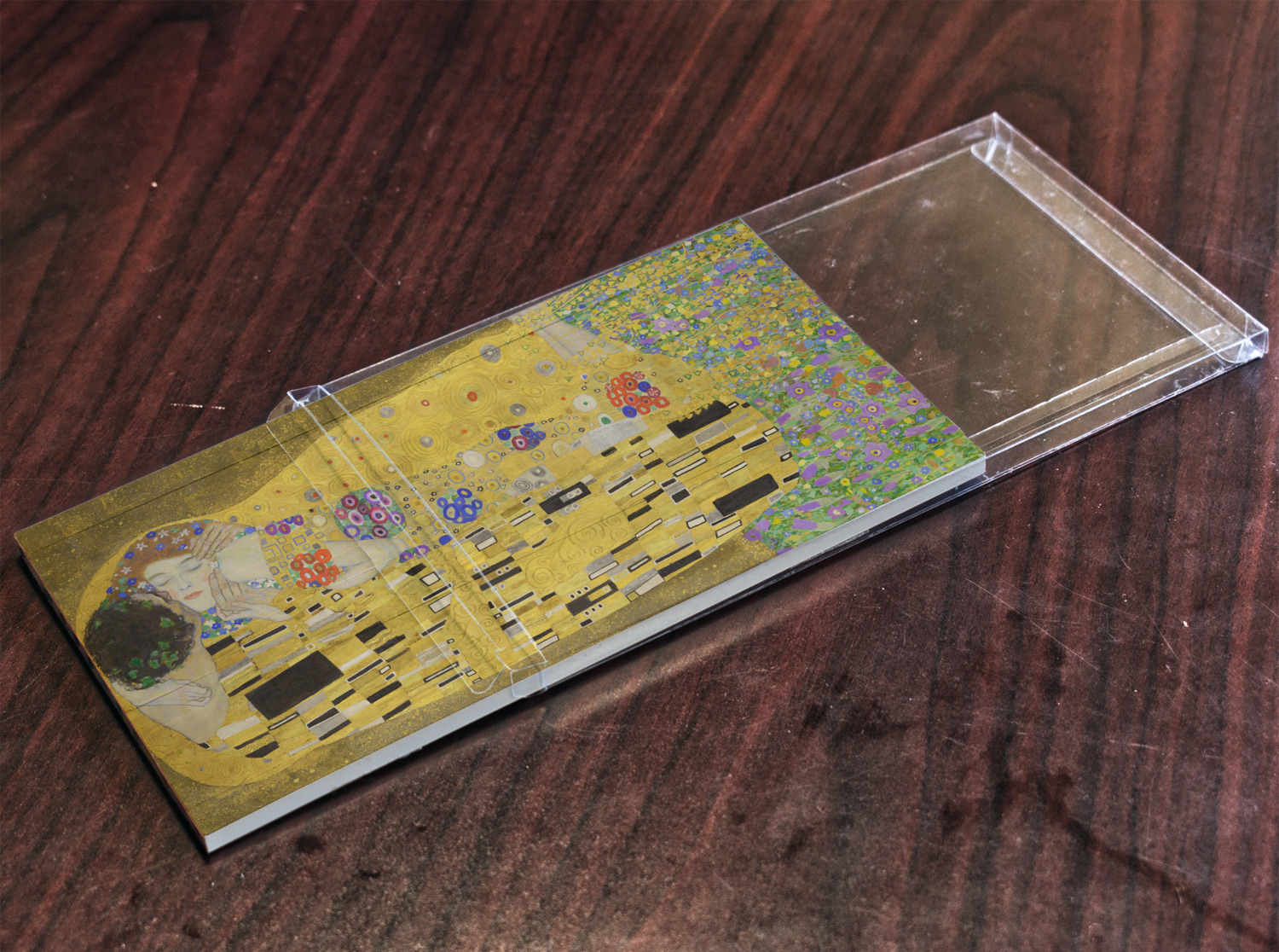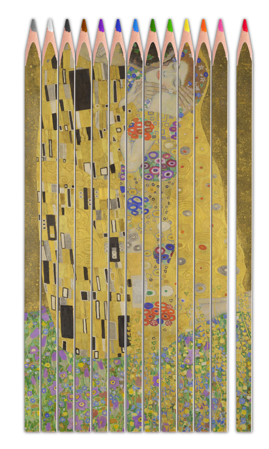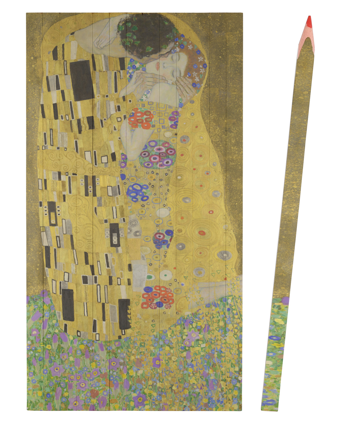 Now you can enjoy this beautiful art on a daily basis. Well not all of it! To put The Kiss (a square) on products, we use as much of the painting as we can on each product. So for a square product like the shower curtain - we use the entire square; however, for other products such as the wristlet (a wide 4x1 rectangle) - you get a small slice of the painting and we use the focal point - which in this case is The Kiss!