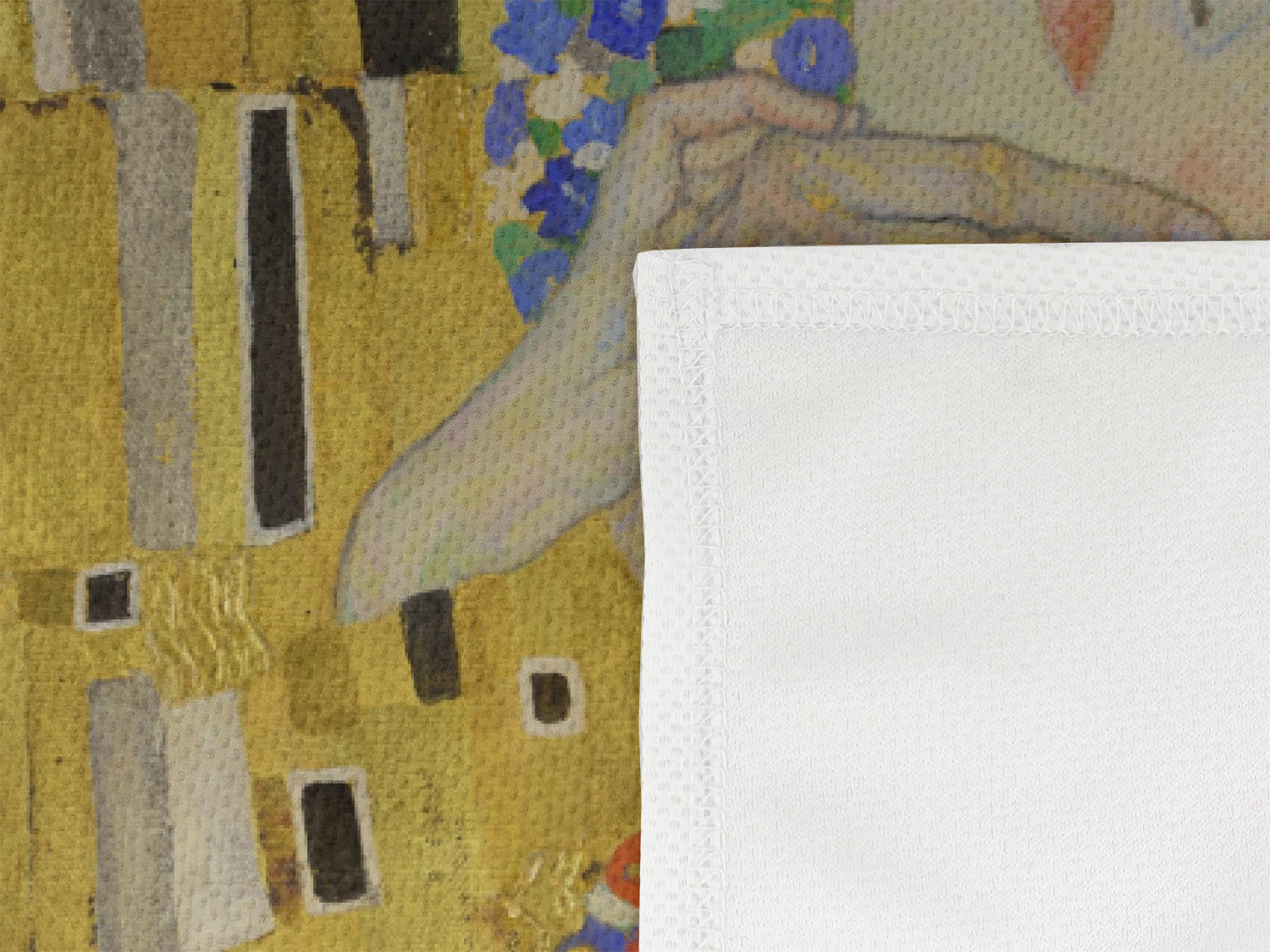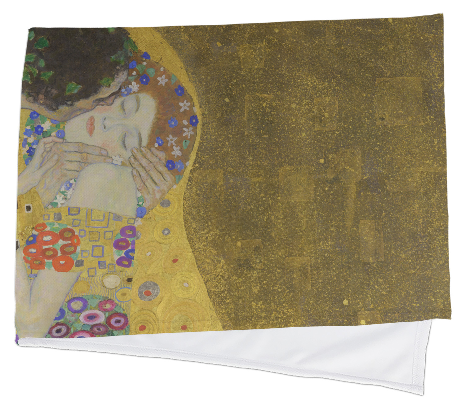 Now you can enjoy this beautiful art on a daily basis. Well not all of it! To put The Kiss (a square) on products, we use as much of the painting as we can on each product. So for a square product like the shower curtain - we use the entire square; however, for other products such as the wristlet (a wide 4x1 rectangle) - you get a small slice of the painting and we use the focal point - which in this case is The Kiss!