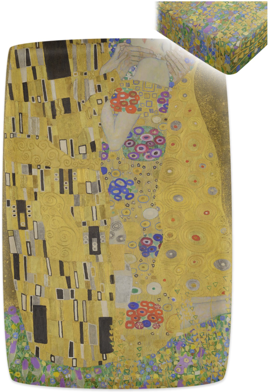Now you can enjoy this beautiful art on a daily basis. Well not all of it! To put The Kiss (a square) on products, we use as much of the painting as we can on each product. So for a square product like the shower curtain - we use the entire square; however, for other products such as the wristlet (a wide 4x1 rectangle) - you get a small slice of the painting and we use the focal point - which in this case is The Kiss!