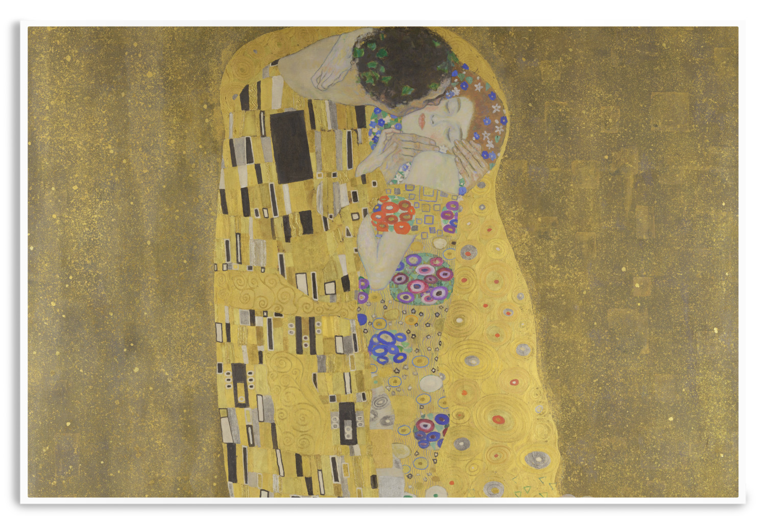 The Kiss (Lovers) was painted by the Austrian Symbolist painter Gustav Klimt between 1907 and 1908, the high-point of his "Golden Period", when he painted a number of works in a similar gilded style. A perfect square, the canvas depicts a couple embracing, their bodies entwined in elaborate robes decorated in a style influenced by both linear constructs of the contemporary Art Nouveau style and the organic forms of the earlier Arts and Crafts movement. The work is composed of oil paint with applied layers of gold leaf, an aspect that gives it its strikingly modern, yet evocative appearance. It is a symbol of Viennese Art Nouveau and is considered Klimt's most popular work.(source: Wikipedia)