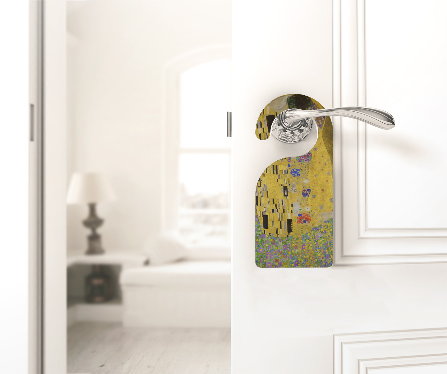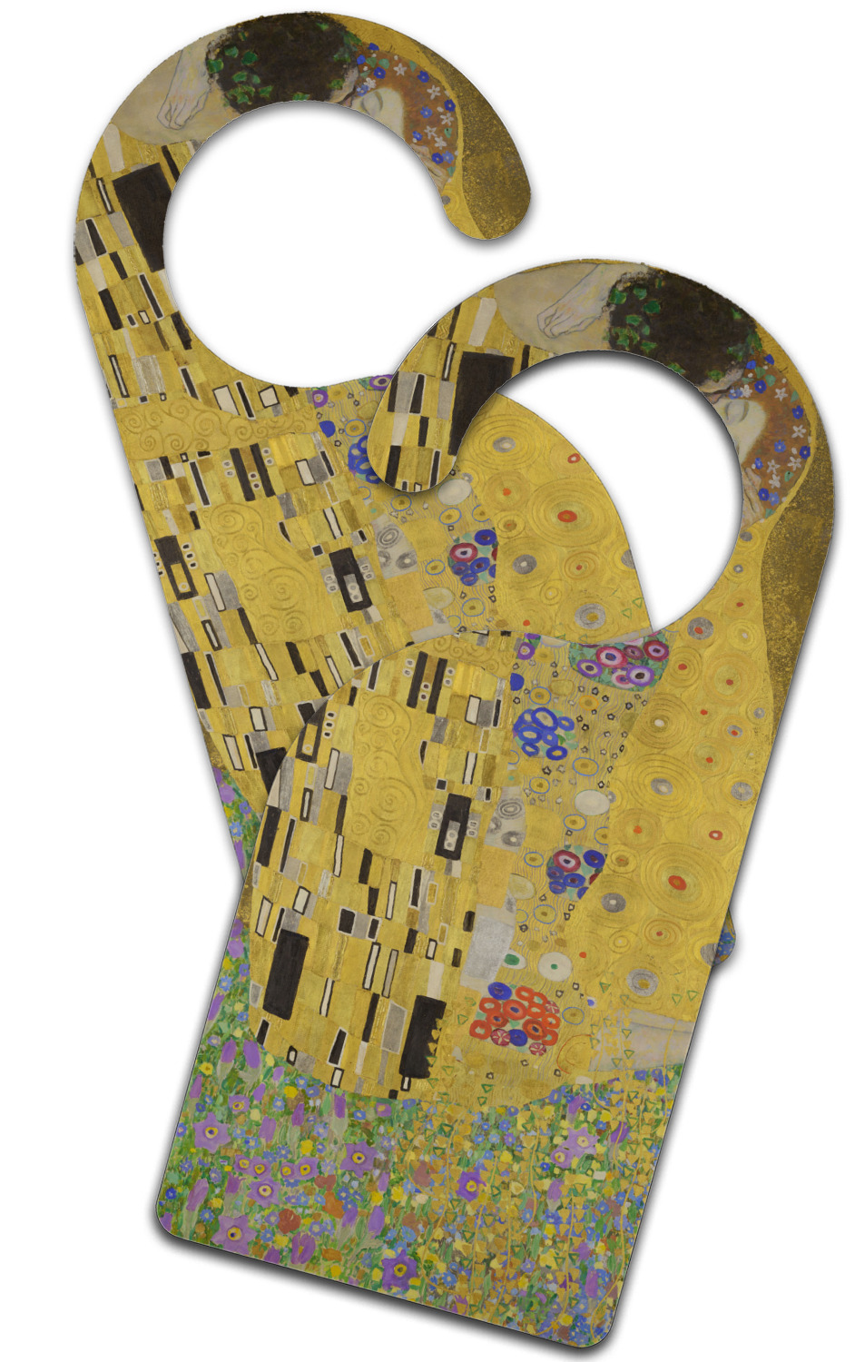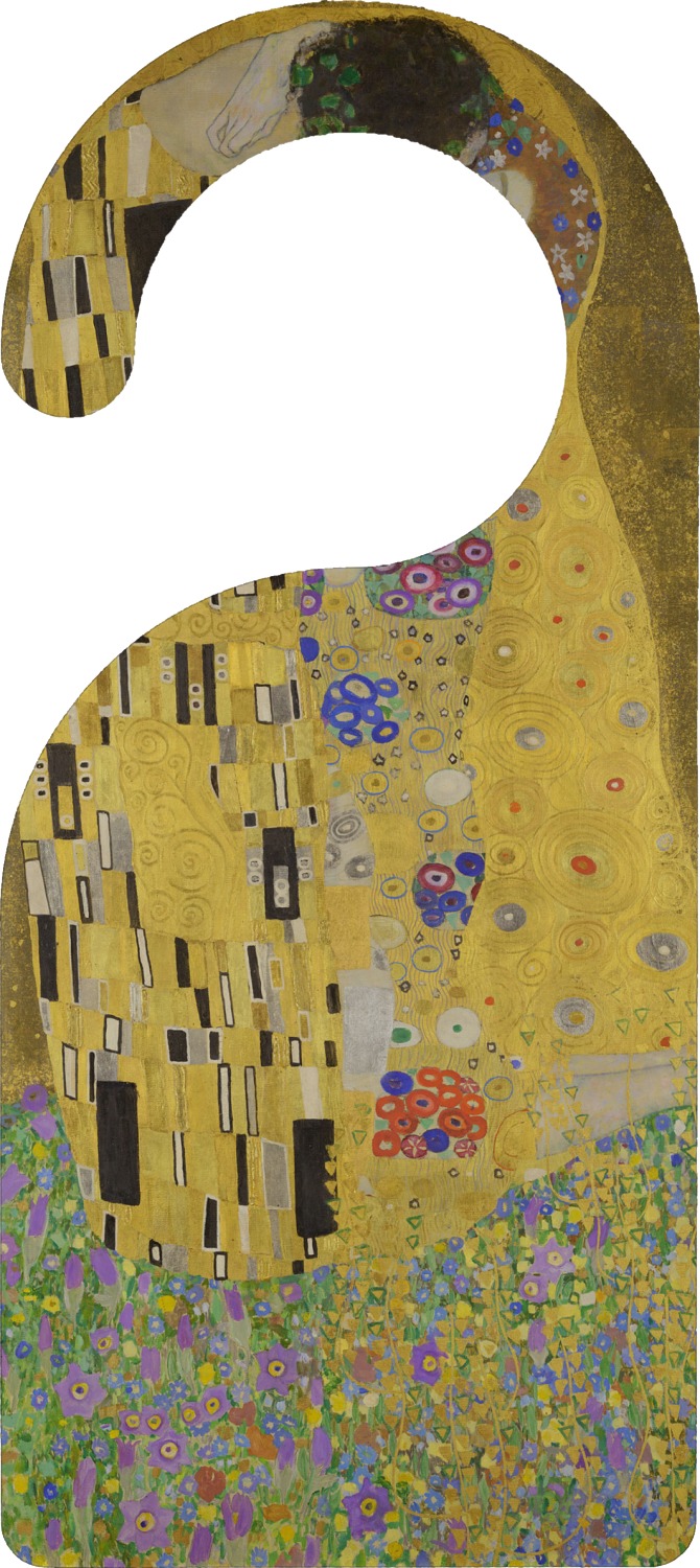 Now you can enjoy this beautiful art on a daily basis. Well not all of it! To put The Kiss (a square) on products, we use as much of the painting as we can on each product. So for a square product like the shower curtain - we use the entire square; however, for other products such as the wristlet (a wide 4x1 rectangle) - you get a small slice of the painting and we use the focal point - which in this case is The Kiss!
