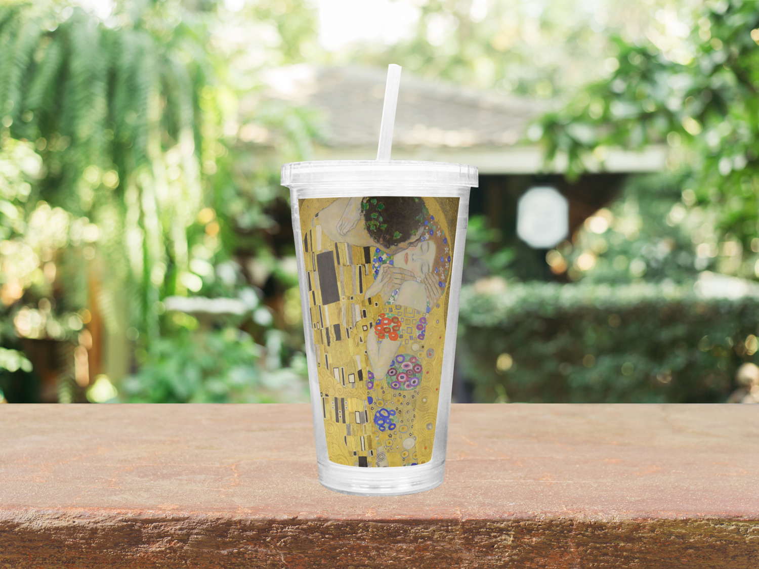These BPA free tumblers with their double walls keep your drink cold and will not sweat on the outside; they have a clear acrylic top and a reusable straw with a ring around the bottom to keep the straw from falling out.