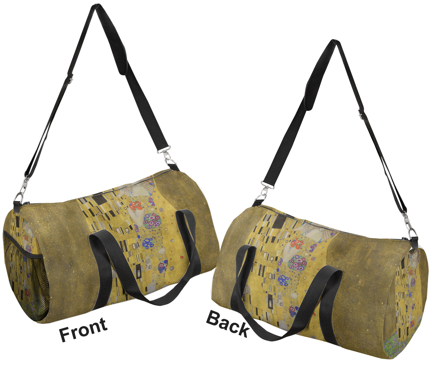 This duffle is a sturdy bag made of a canvas material. It comes in two sizes: Small (19"W x 9.5"H x 9.5"D) and Large (23"W x 12"H x 12"D). The bag is a cylindrical shape with a black adjustable strap and two handles. On one side is an elastic pouch to put a waterbottle or other small item. Your product will be sublimated with your design and is able to be designed on the front, back, and sides. Be sure to remember that the straps may cut into parts of your design if you upload your own artwork.