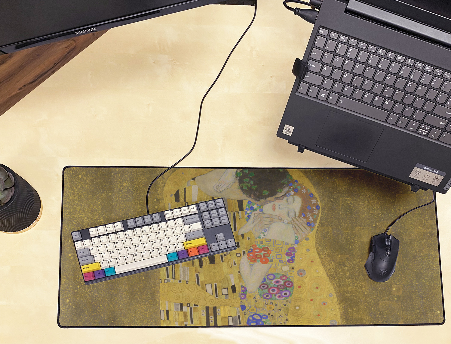 Now you can enjoy this beautiful art on a daily basis. Well not all of it! To put The Kiss (a square) on products, we use as much of the painting as we can on each product. So for a square product like the shower curtain - we use the entire square; however, for other products such as the wristlet (a wide 4x1 rectangle) - you get a small slice of the painting and we use the focal point - which in this case is The Kiss!