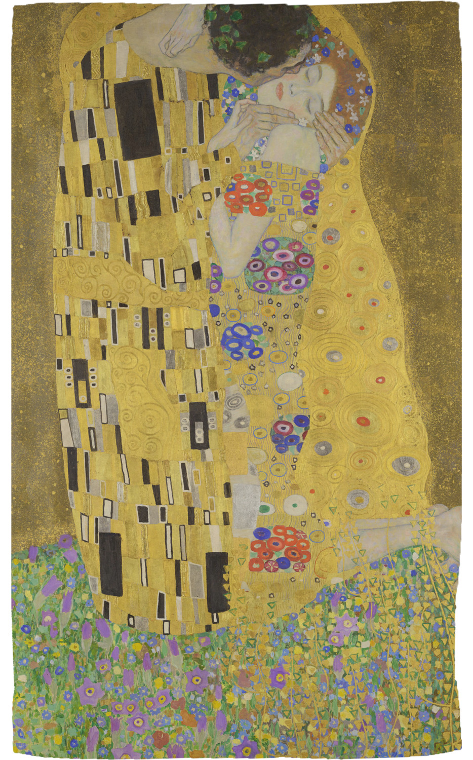 The Kiss (Lovers) was painted by the Austrian Symbolist painter Gustav Klimt between 1907 and 1908, the high-point of his "Golden Period", when he painted a number of works in a similar gilded style. A perfect square, the canvas depicts a couple embracing, their bodies entwined in elaborate robes decorated in a style influenced by both linear constructs of the contemporary Art Nouveau style and the organic forms of the earlier Arts and Crafts movement. The work is composed of oil paint with applied layers of gold leaf, an aspect that gives it its strikingly modern, yet evocative appearance. It is a symbol of Viennese Art Nouveau and is considered Klimt's most popular work.(source: Wikipedia)