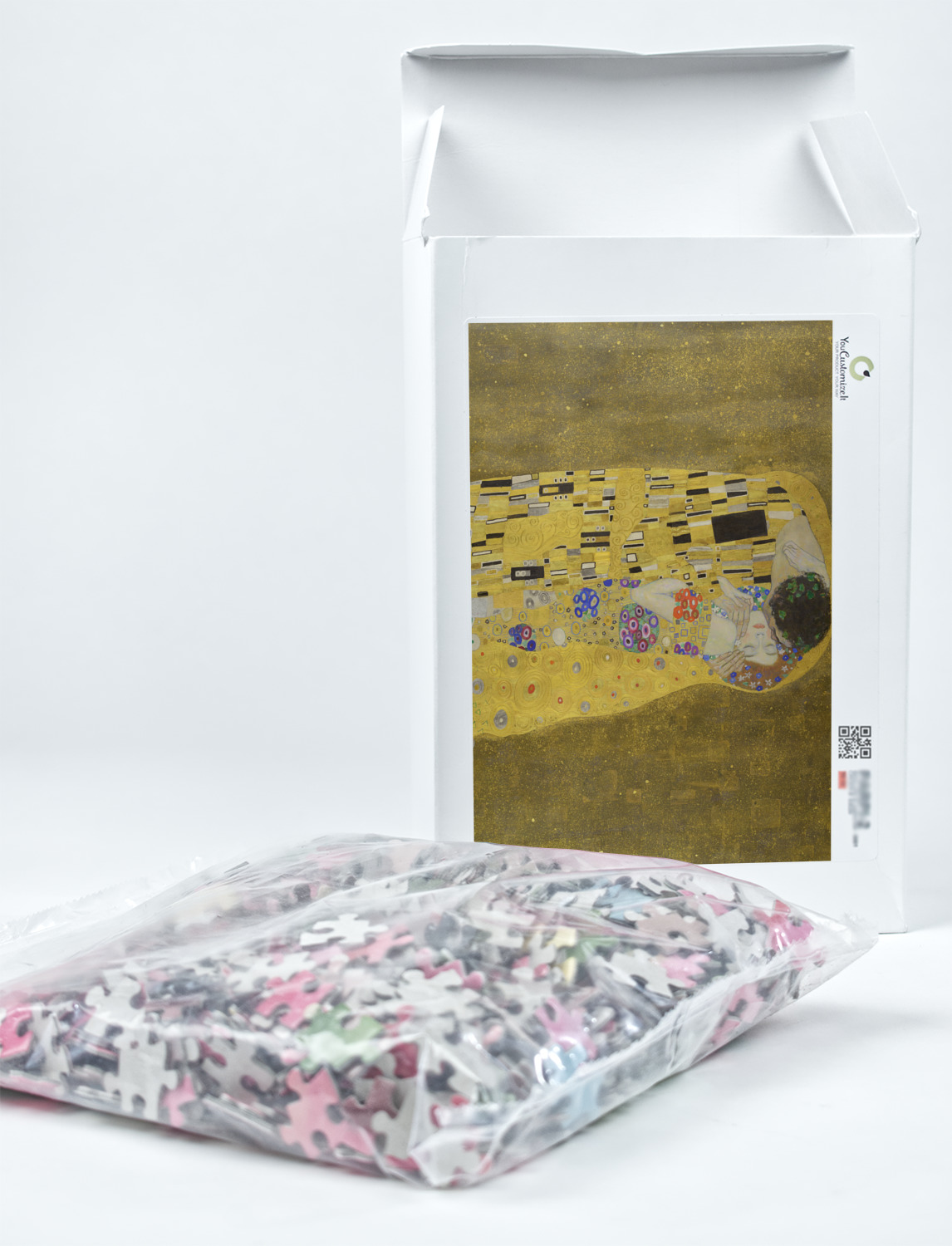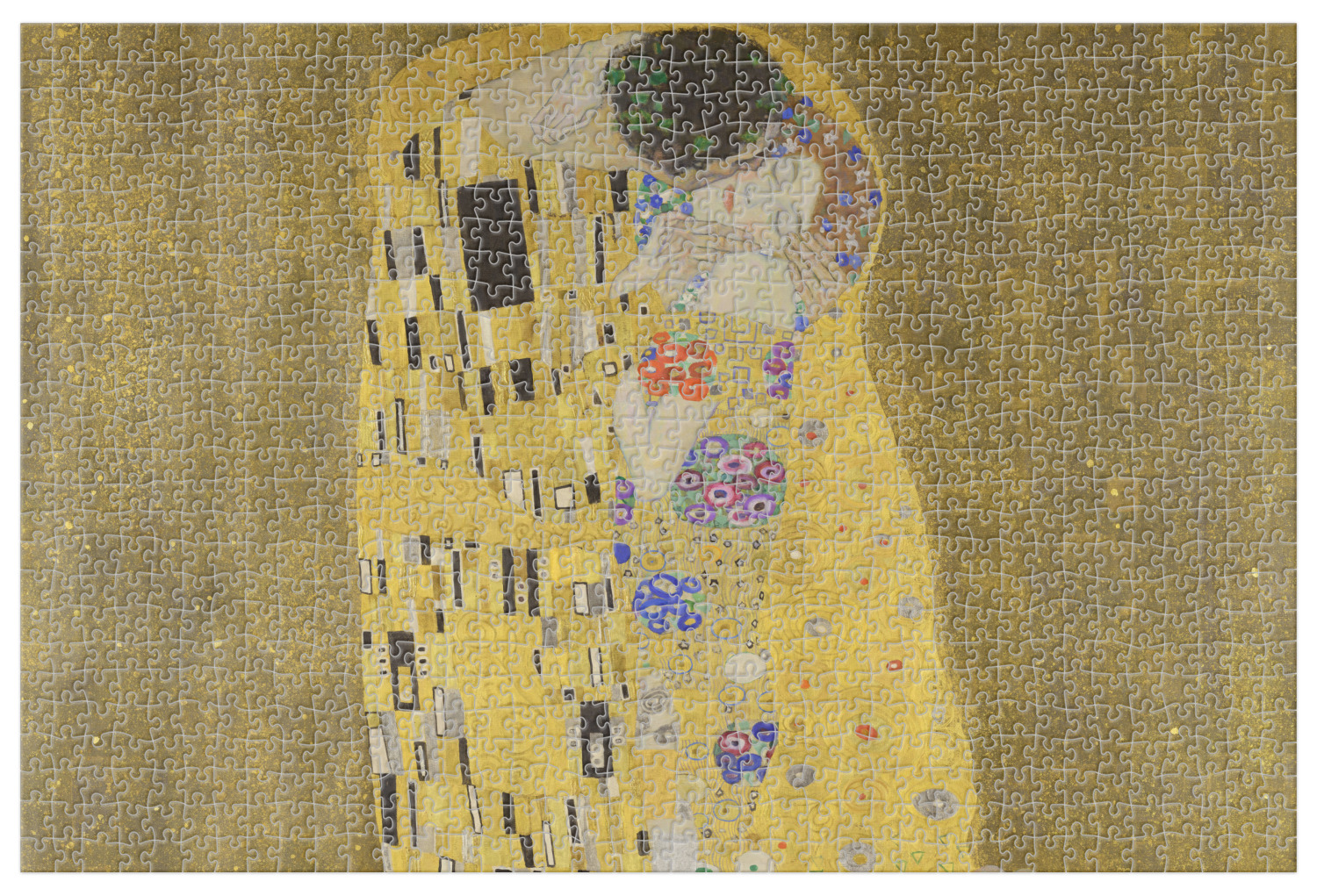 The Kiss (Lovers) was painted by the Austrian Symbolist painter Gustav Klimt between 1907 and 1908, the high-point of his "Golden Period", when he painted a number of works in a similar gilded style. A perfect square, the canvas depicts a couple embracing, their bodies entwined in elaborate robes decorated in a style influenced by both linear constructs of the contemporary Art Nouveau style and the organic forms of the earlier Arts and Crafts movement. The work is composed of oil paint with applied layers of gold leaf, an aspect that gives it its strikingly modern, yet evocative appearance. It is a symbol of Viennese Art Nouveau and is considered Klimt's most popular work.(source: Wikipedia)