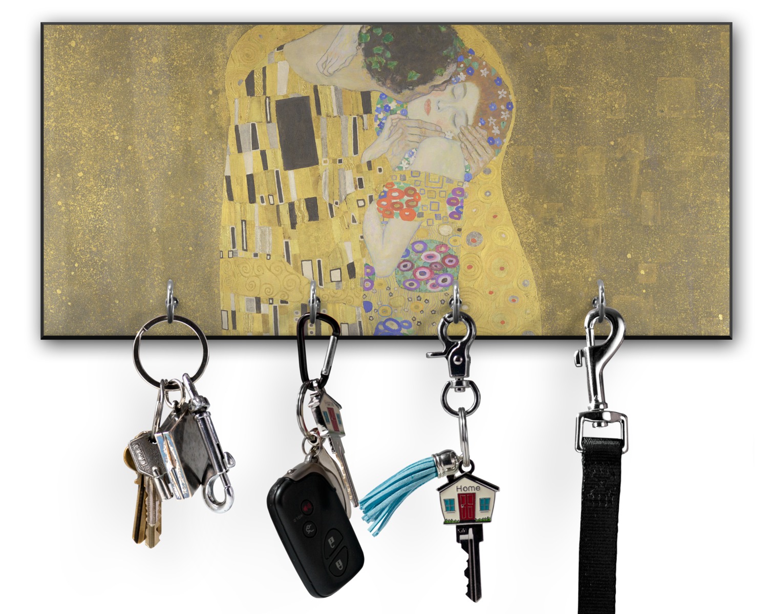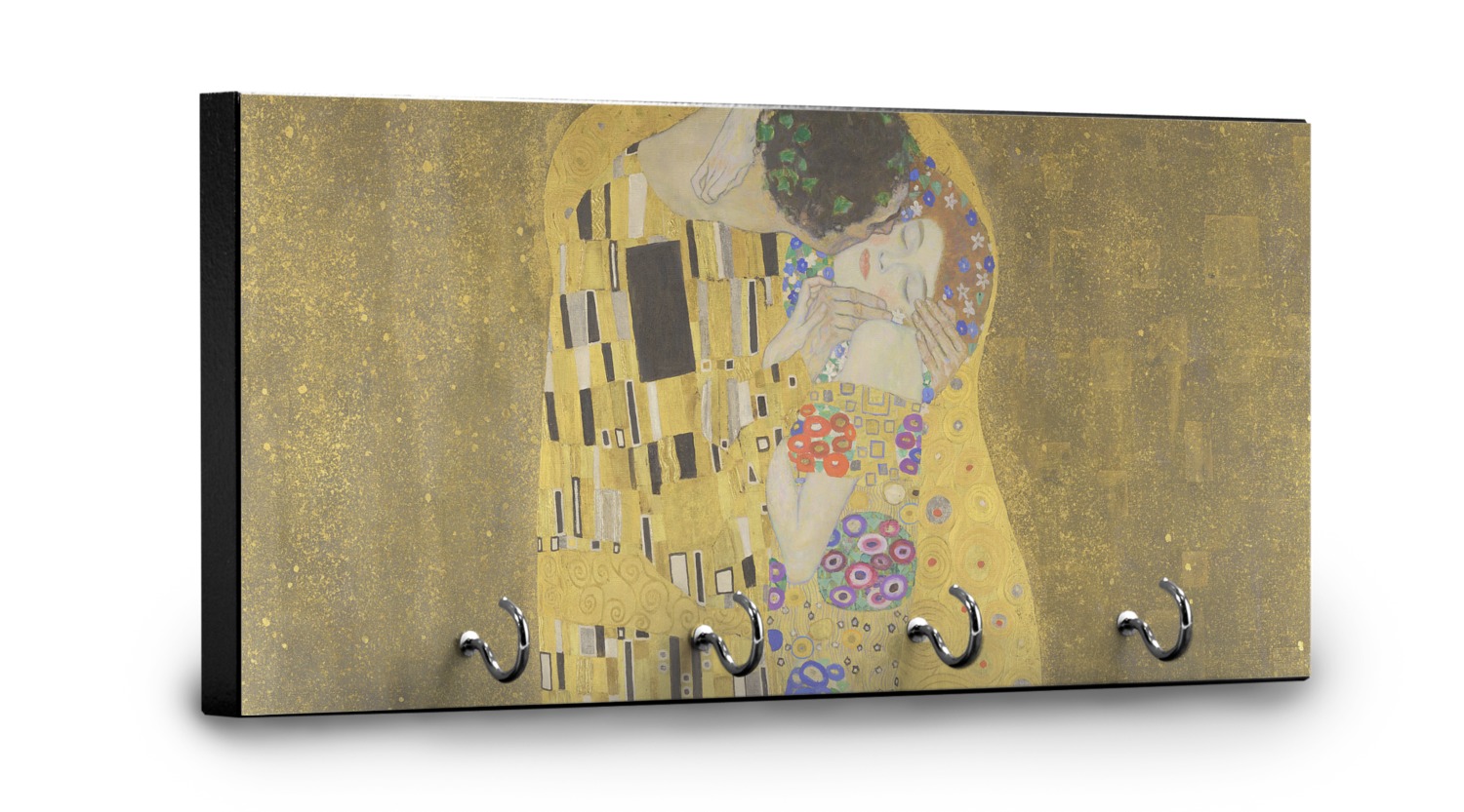 Now you can enjoy this beautiful art on a daily basis. Well not all of it! To put The Kiss (a square) on products, we use as much of the painting as we can on each product. So for a square product like the shower curtain - we use the entire square; however, for other products such as the wristlet (a wide 4x1 rectangle) - you get a small slice of the painting and we use the focal point - which in this case is The Kiss!