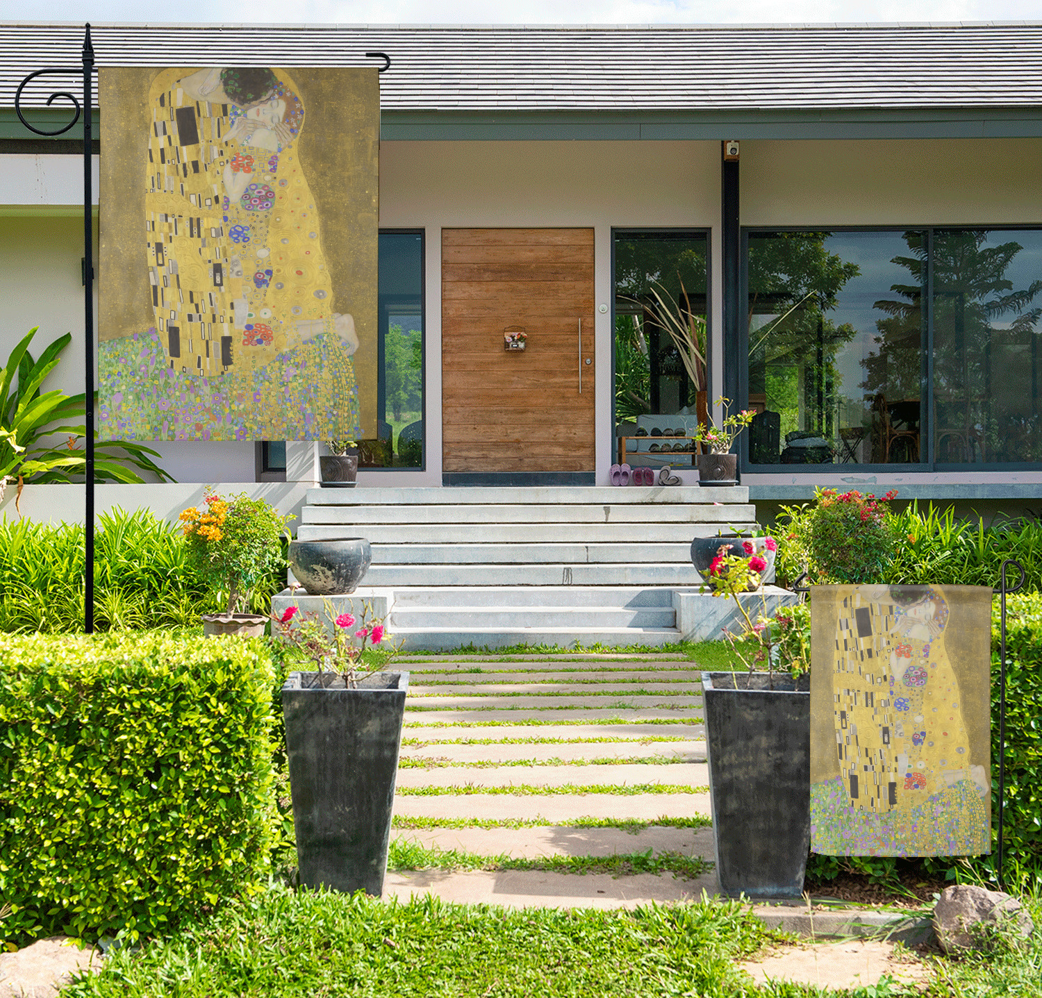 The Kiss (Lovers) was painted by the Austrian Symbolist painter Gustav Klimt between 1907 and 1908, the high-point of his "Golden Period", when he painted a number of works in a similar gilded style. A perfect square, the canvas depicts a couple embracing, their bodies entwined in elaborate robes decorated in a style influenced by both linear constructs of the contemporary Art Nouveau style and the organic forms of the earlier Arts and Crafts movement. The work is composed of oil paint with applied layers of gold leaf, an aspect that gives it its strikingly modern, yet evocative appearance. It is a symbol of Viennese Art Nouveau and is considered Klimt's most popular work.(source: Wikipedia)
