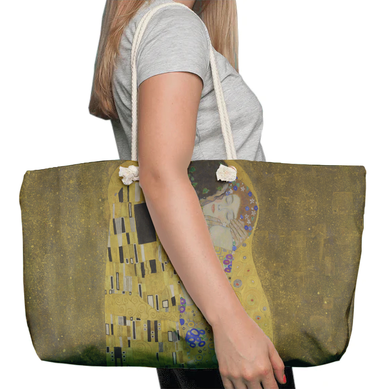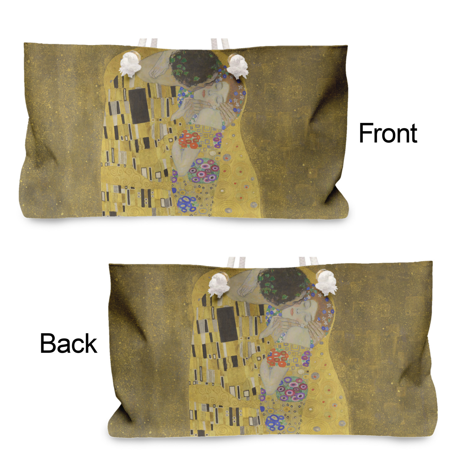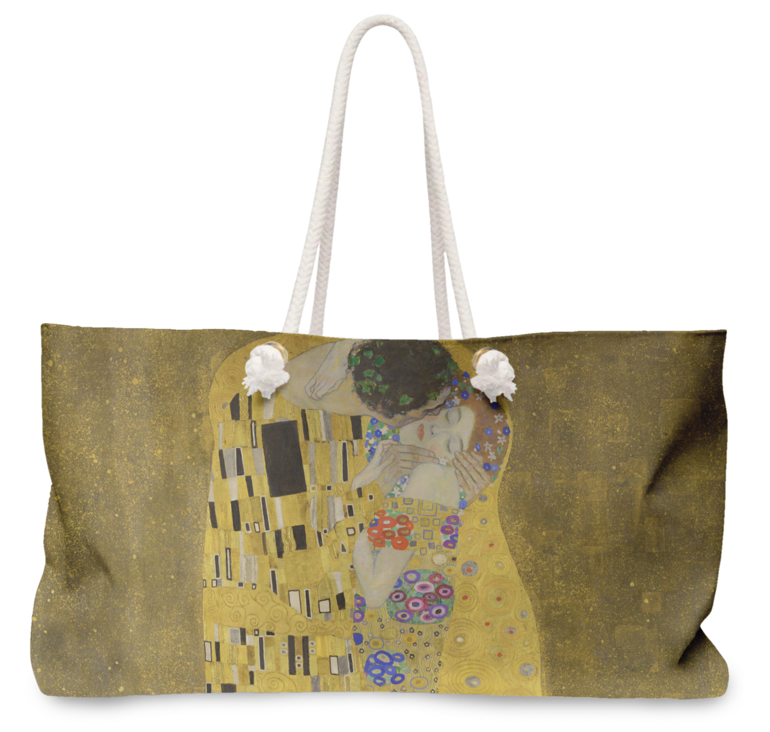 Now you can enjoy this beautiful art on a daily basis. Well not all of it! To put The Kiss (a square) on products, we use as much of the painting as we can on each product. So for a square product like the shower curtain - we use the entire square; however, for other products such as the wristlet (a wide 4x1 rectangle) - you get a small slice of the painting and we use the focal point - which in this case is The Kiss!