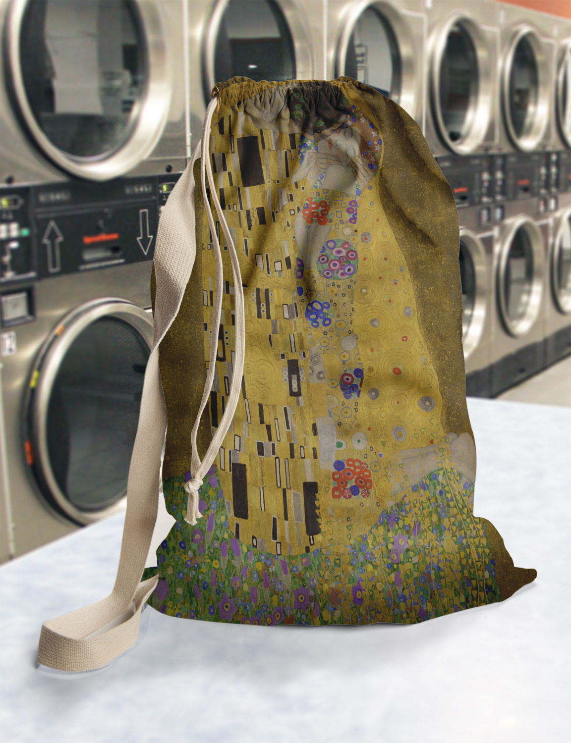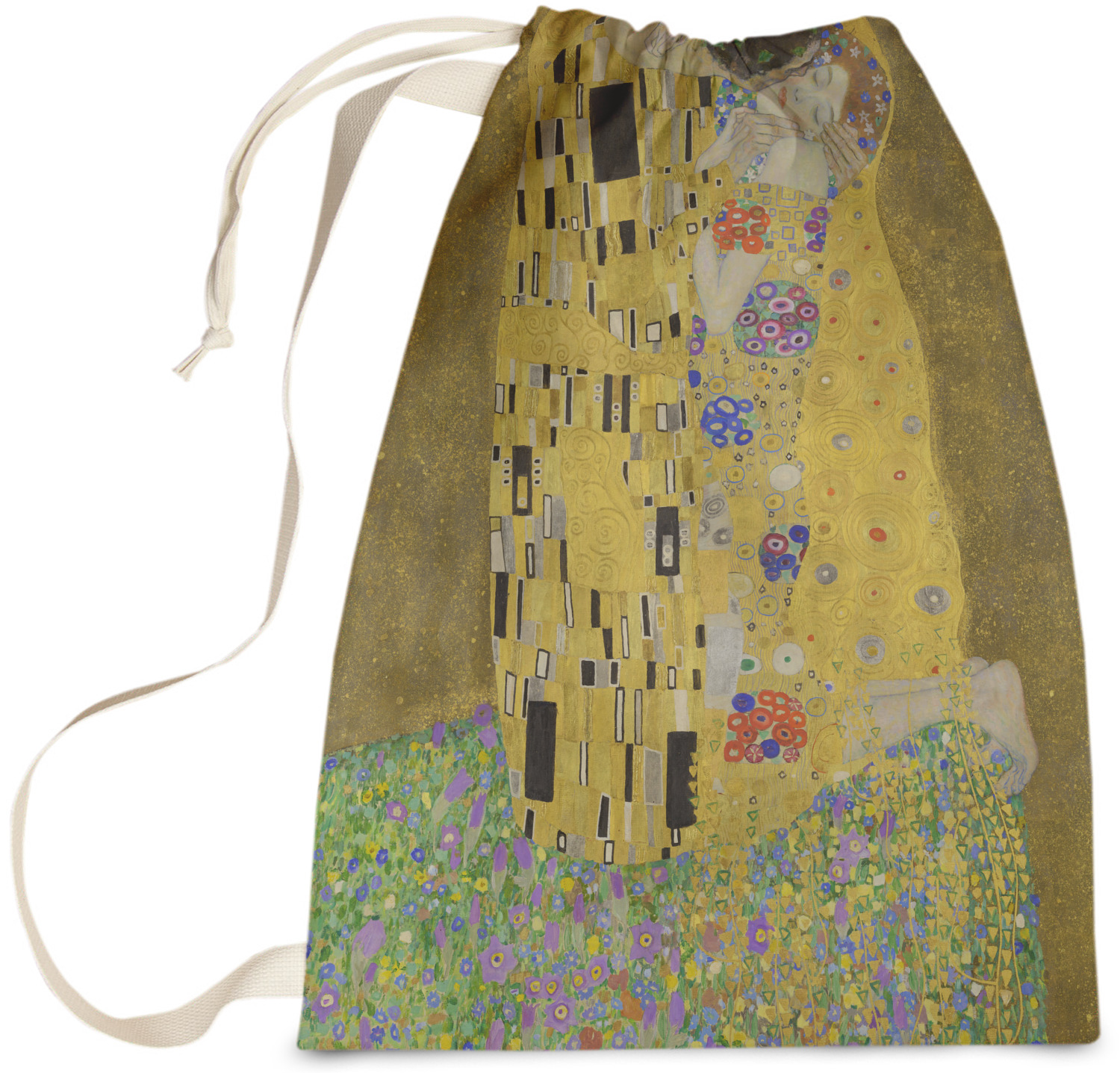 Now you can enjoy this beautiful art on a daily basis. Well not all of it! To put The Kiss (a square) on products, we use as much of the painting as we can on each product. So for a square product like the shower curtain - we use the entire square; however, for other products such as the wristlet (a wide 4x1 rectangle) - you get a small slice of the painting and we use the focal point - which in this case is The Kiss!