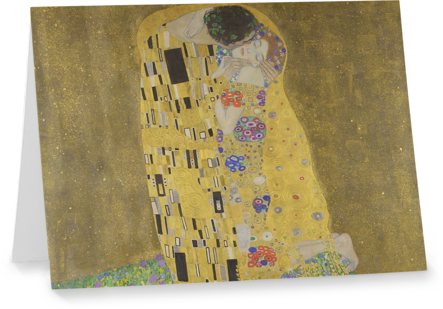 The Kiss (Lovers) was painted by the Austrian Symbolist painter Gustav Klimt between 1907 and 1908, the high-point of his "Golden Period", when he painted a number of works in a similar gilded style. A perfect square, the canvas depicts a couple embracing, their bodies entwined in elaborate robes decorated in a style influenced by both linear constructs of the contemporary Art Nouveau style and the organic forms of the earlier Arts and Crafts movement. The work is composed of oil paint with applied layers of gold leaf, an aspect that gives it its strikingly modern, yet evocative appearance. It is a symbol of Viennese Art Nouveau and is considered Klimt's most popular work.(source: Wikipedia)