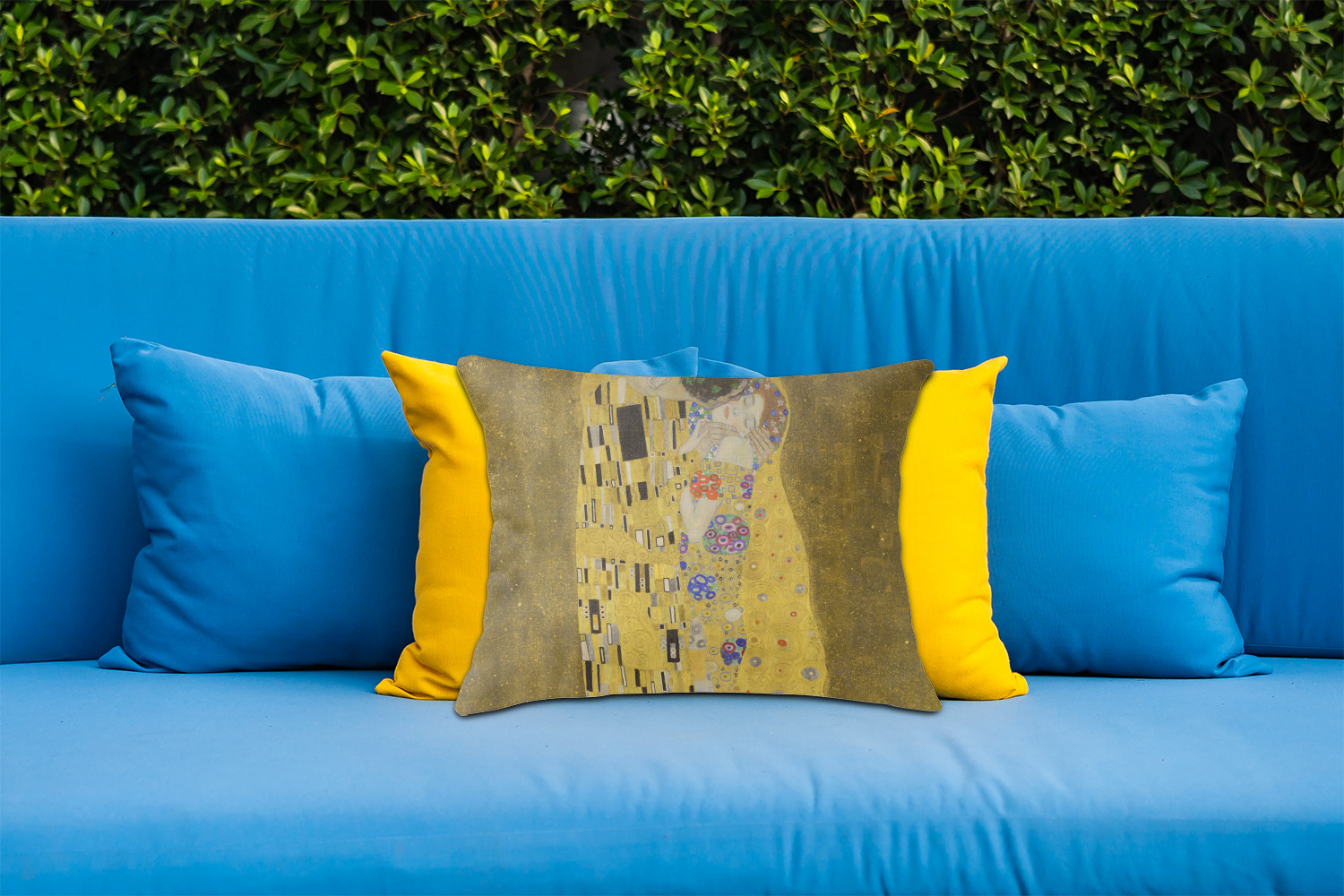 Now you can enjoy this beautiful art on a daily basis. Well not all of it! To put The Kiss (a square) on products, we use as much of the painting as we can on each product. So for a square product like the shower curtain - we use the entire square; however, for other products such as the wristlet (a wide 4x1 rectangle) - you get a small slice of the painting and we use the focal point - which in this case is The Kiss!