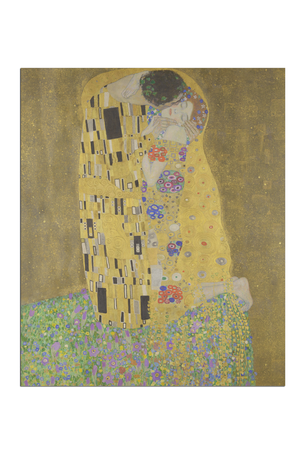 The Kiss (Lovers) was painted by the Austrian Symbolist painter Gustav Klimt between 1907 and 1908, the high-point of his "Golden Period", when he painted a number of works in a similar gilded style. A perfect square, the canvas depicts a couple embracing, their bodies entwined in elaborate robes decorated in a style influenced by both linear constructs of the contemporary Art Nouveau style and the organic forms of the earlier Arts and Crafts movement. The work is composed of oil paint with applied layers of gold leaf, an aspect that gives it its strikingly modern, yet evocative appearance. It is a symbol of Viennese Art Nouveau and is considered Klimt's most popular work.(source: Wikipedia)