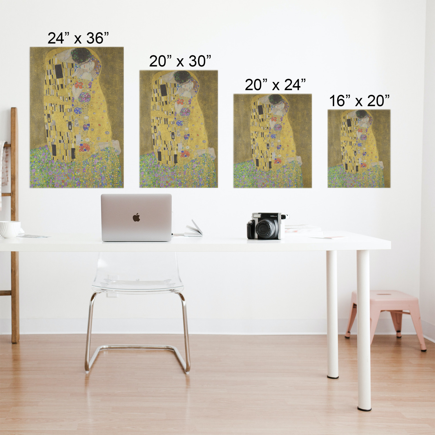 The Kiss (Lovers) was painted by the Austrian Symbolist painter Gustav Klimt between 1907 and 1908, the high-point of his "Golden Period", when he painted a number of works in a similar gilded style. A perfect square, the canvas depicts a couple embracing, their bodies entwined in elaborate robes decorated in a style influenced by both linear constructs of the contemporary Art Nouveau style and the organic forms of the earlier Arts and Crafts movement. The work is composed of oil paint with applied layers of gold leaf, an aspect that gives it its strikingly modern, yet evocative appearance. It is a symbol of Viennese Art Nouveau and is considered Klimt's most popular work.(source: Wikipedia)