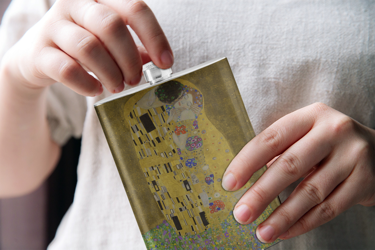 Now you can enjoy this beautiful art on a daily basis. Well not all of it! To put The Kiss (a square) on products, we use as much of the painting as we can on each product. So for a square product like the shower curtain - we use the entire square; however, for other products such as the wristlet (a wide 4x1 rectangle) - you get a small slice of the painting and we use the focal point - which in this case is The Kiss!