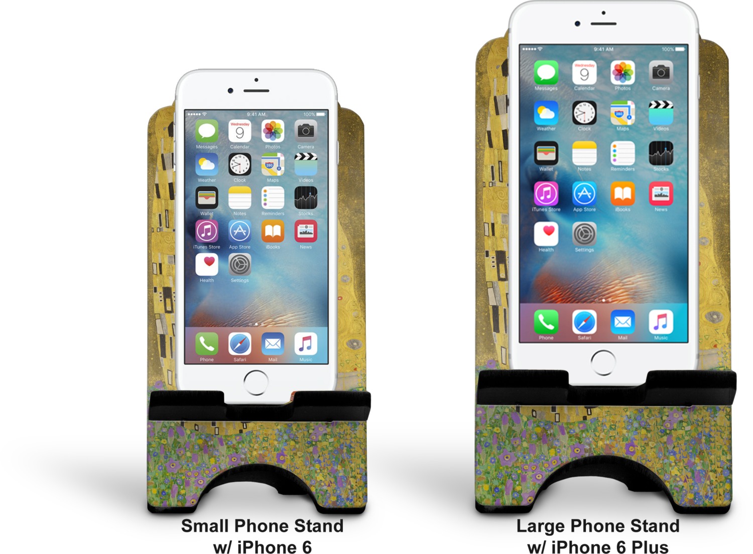 To meet your needs, we offer four variations of this IPhone stand. The backboard of the first version is shaped as a plain, yet sleek rectangle, and is available in two sizes. Our smaller size is approximately 4 by 3.25 by 7 inches, while the larger model is 4 by 3.77 by 8.5 inches. Alongside this model, we also provide you with a more decorative option. The upper part of our second version features a curved edge, for a classy, suave appearance. This phone holder is also sold in two sizes: a smaller version, which is 4 by 3.25 by 7 inches, and our larger model, which is 4 by 3.77 by 8.5 inches. Both models will support large phones, but the larger model is better if you wish to proudly display your personalized design.