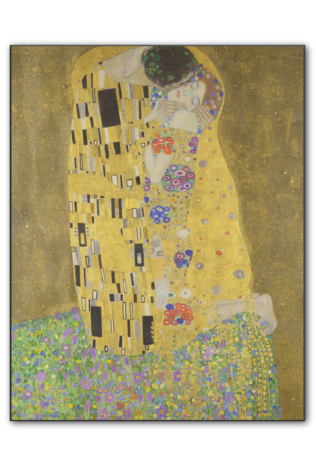 The Kiss (Lovers) was painted by the Austrian Symbolist painter Gustav Klimt between 1907 and 1908, the high-point of his "Golden Period", when he painted a number of works in a similar gilded style. A perfect square, the canvas depicts a couple embracing, their bodies entwined in elaborate robes decorated in a style influenced by both linear constructs of the contemporary Art Nouveau style and the organic forms of the earlier Arts and Crafts movement. The work is composed of oil paint with applied layers of gold leaf, an aspect that gives it its strikingly modern, yet evocative appearance. It is a symbol of Viennese Art Nouveau and is considered Klimt's most popular work.(source: Wikipedia)