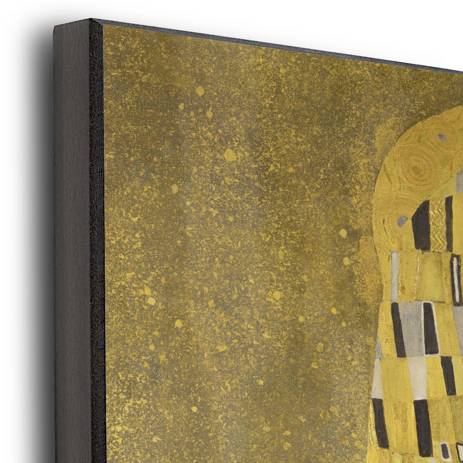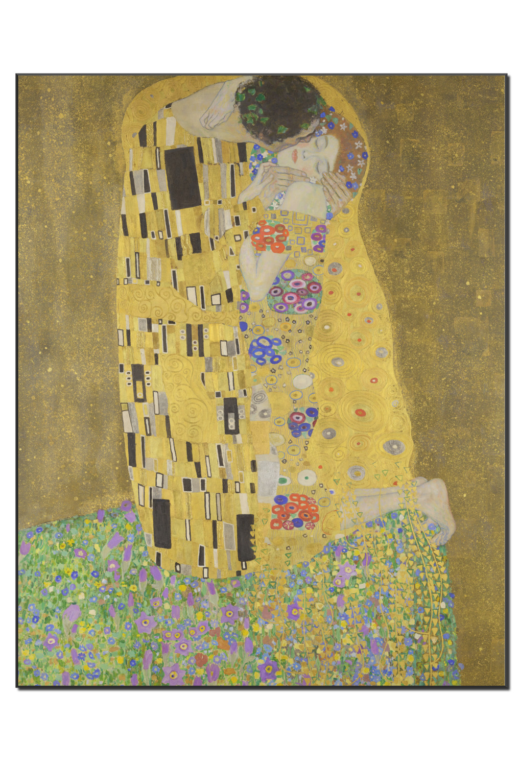 The Kiss (Lovers) was painted by the Austrian Symbolist painter Gustav Klimt between 1907 and 1908, the high-point of his "Golden Period", when he painted a number of works in a similar gilded style. A perfect square, the canvas depicts a couple embracing, their bodies entwined in elaborate robes decorated in a style influenced by both linear constructs of the contemporary Art Nouveau style and the organic forms of the earlier Arts and Crafts movement. The work is composed of oil paint with applied layers of gold leaf, an aspect that gives it its strikingly modern, yet evocative appearance. It is a symbol of Viennese Art Nouveau and is considered Klimt's most popular work.(source: Wikipedia)