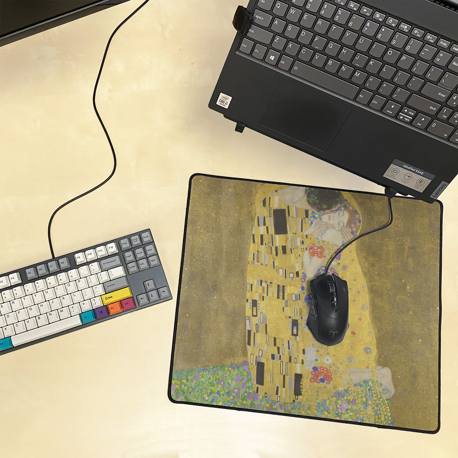 Now you can enjoy this beautiful art on a daily basis. Well not all of it! To put The Kiss (a square) on products, we use as much of the painting as we can on each product. So for a square product like the shower curtain - we use the entire square; however, for other products such as the wristlet (a wide 4x1 rectangle) - you get a small slice of the painting and we use the focal point - which in this case is The Kiss!