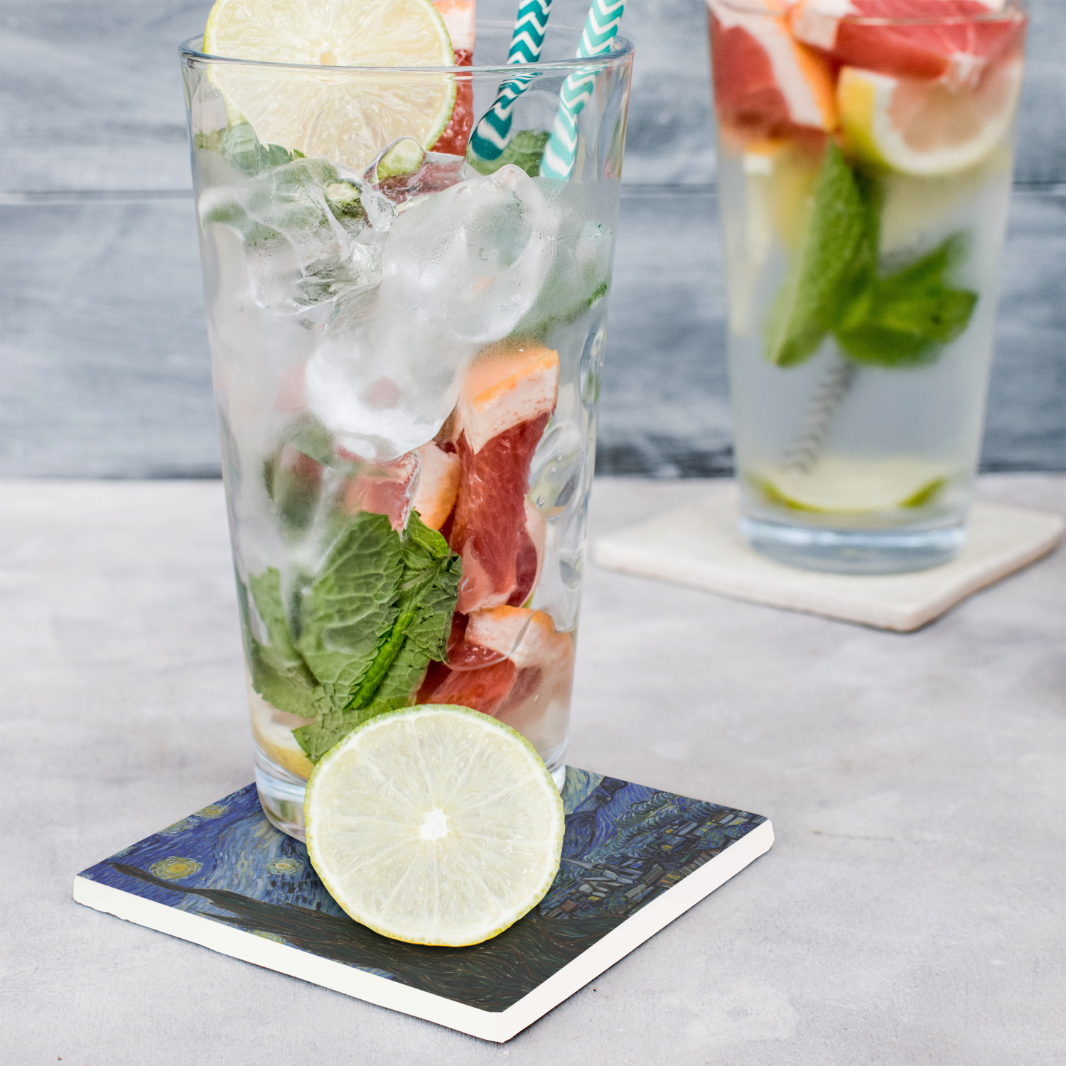 Our super absorbent stone coasters absorb the condensation into the coaster, before it has a chance to flow on to your furniture or table tops, thus preventing watermarks and blemishes.
