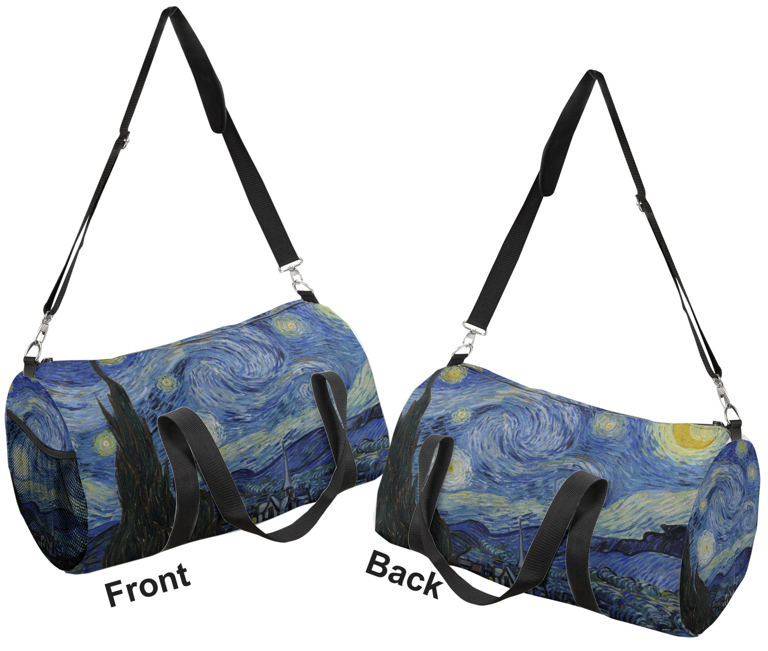 This duffle is a sturdy bag made of a canvas material. It comes in two sizes: Small (19"W x 9.5"H x 9.5"D) and Large (23"W x 12"H x 12"D). The bag is a cylindrical shape with a black adjustable strap and two handles. On one side is an elastic pouch to put a waterbottle or other small item. Your product will be sublimated with your design and is able to be designed on the front, back, and sides. Be sure to remember that the straps may cut into parts of your design if you upload your own artwork.
