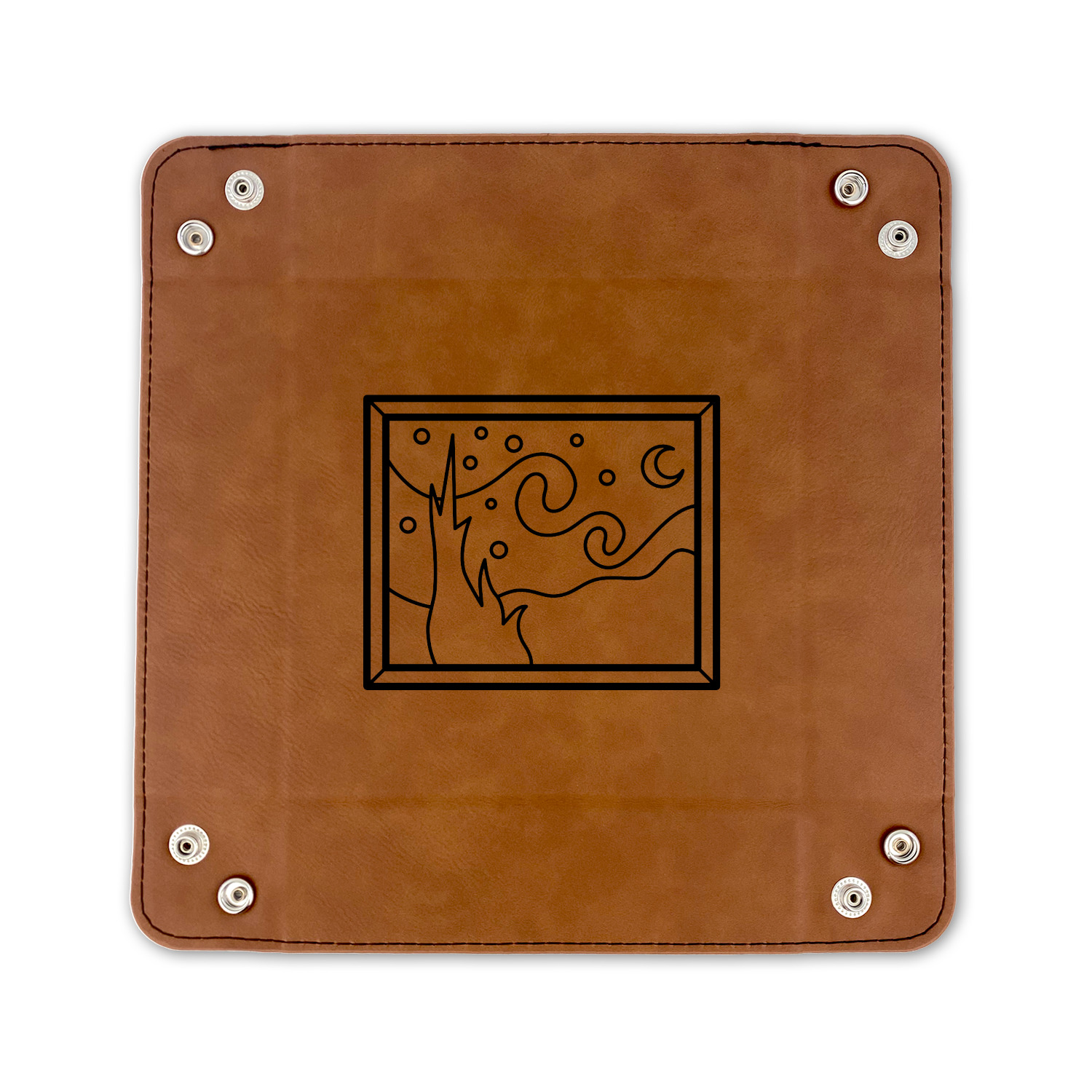 The leatherette wraps the hard board base and sides with flexible hinges to fold the sides up. The corners are secured using silver snaps. The 6in x 6 in tray measures approximately 9.5in x 9.5in when laid flat. The 9in x 9in tray measures approximately 13in x 13in when laid flat.