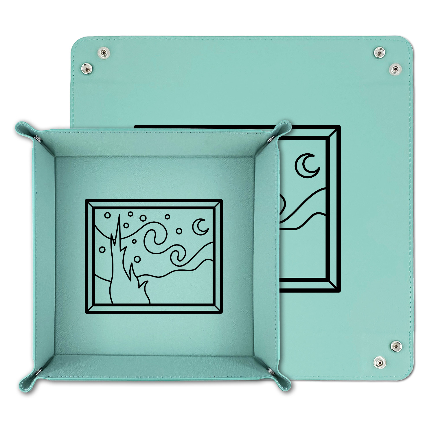 The leatherette wraps the hard board base and sides with flexible hinges to fold the sides up. The corners are secured using silver snaps. The 6in x 6 in tray measures approximately 9.5in x 9.5in when laid flat. The 9in x 9in tray measures approximately 13in x 13in when laid flat.