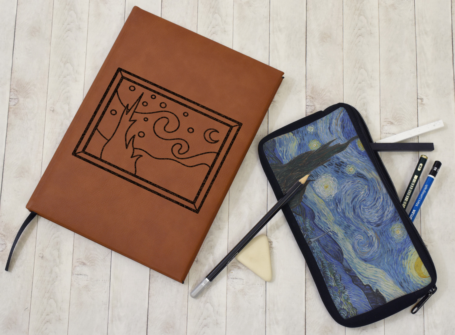 The faux leather covers are a rich cognac / rawhide color and can be customized with your design. From a simple name or monogram or a logo to a detailed mandala - the choice for customization & personalization is truly yours. Customize one of our designs or upload your own.