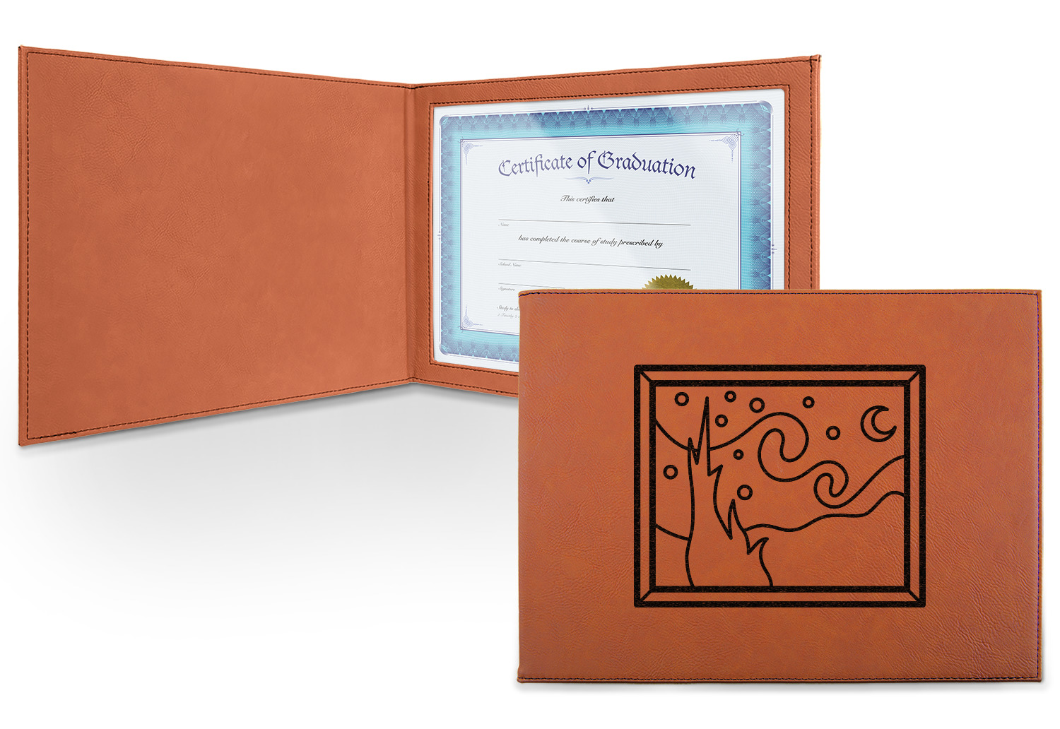 This cognac-colored, leatherette certificate jacket is the ideal way to display or store your hard-earned certificate. When closed, the custom certificate holder measures at 12 by 9 inches. The interior of the certificate cover includes a clear, vinyl window to encase your diploma. The window measures at around 10.5 by 7.5 inches and can accommodate a diploma that measures at up to 8.5 by 11 inches. You can either choose to have your customization laser engraved on the front and interior, or solely the front.