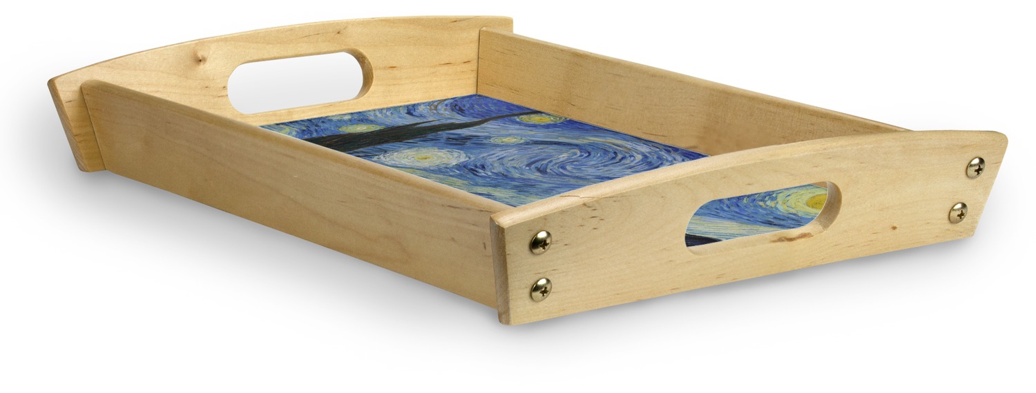 This serving tray with handles features square edges and two rounded sides, creating a very modern look. Each side is fabricated from a beautifully cut, natural wood. The bottom of the interior of the tray displays your customized design in bright, vibrant color. The tray is sold in both a black color and a natural wood look. Each variation of the wood serving tray has two sizes: Small, which is 14" x 10" x 2.25", and Large, which is 19.5" x 13.5" x 2.75".