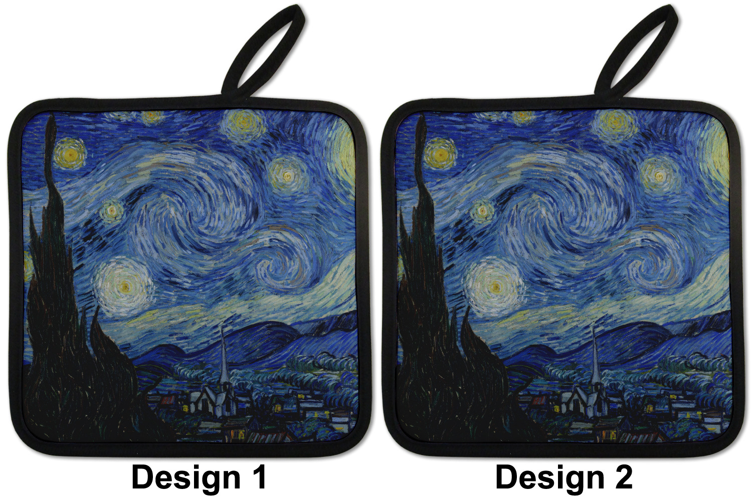 Our personalized pot holders feature a neoprene front that displays your personalization in vibrant colors. The backing of the hot pot holder is rubberized; the textured backing allows you to have a great grip when using this custom pot holder. The two materials are joined with a sleek, black trim, and the holder also includes an attached loop for hanging and storage. The pot holder is approximately 8.75 inches by 8.75 inches and 0.25 inches tall, while the fabric loop is 2.5 inches long. You can purchase a kitchen pot holder by itself or as a set of 2. We also offer a set including one pot holder and one oven mitt.