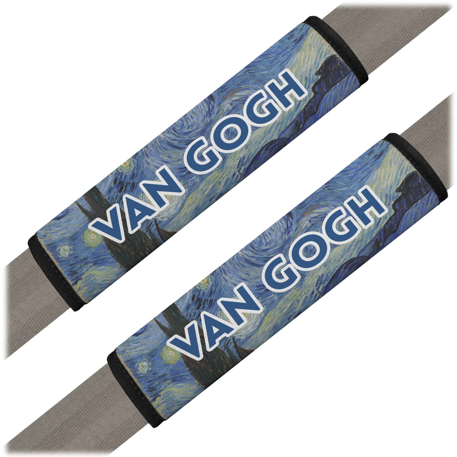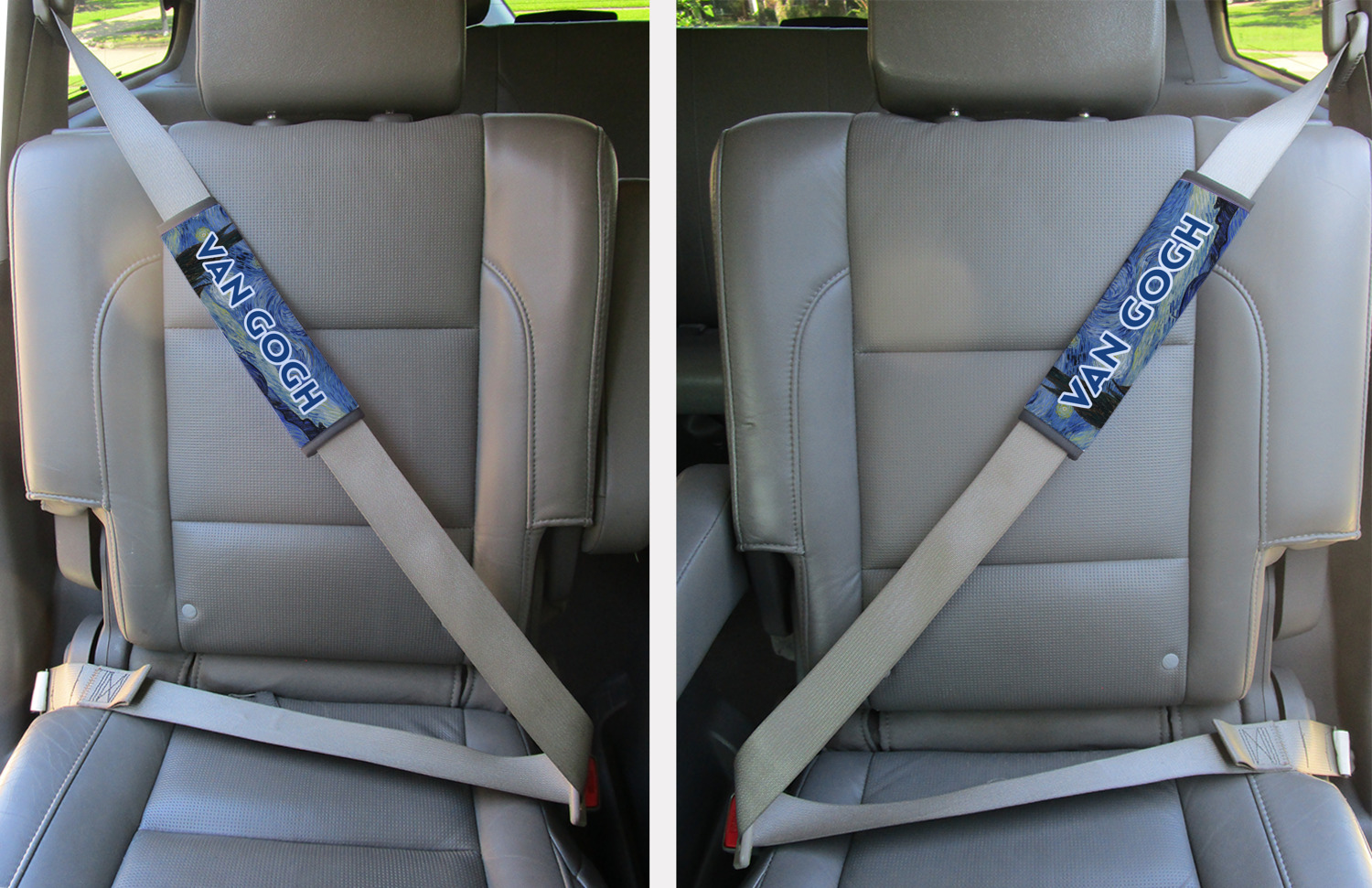 Made from neoprene, our seat belt strap covers wrap around the belt itself and have a Velcro tab for easy attachment and closure. The belt's edges are trimmed with a black polyester for a secure finish. Each cover is 9.5 by 7 inches when open and 9.5 by 2.5 inches when closed. We print your personalized design on the face of the seat belt pad.