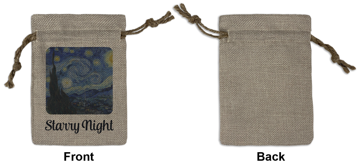 We sell our Burlap Gift Bags in 3 variant sized bags. Made with burlap polyester, each personalized bag can be secured with a twine drawstring pull. Your custom design is available to print on one side or both sides - completely up to you! The sizes of the bags measure approximately 4.5" x 6.5" for the smallest size, 6.5" x 8.0" for the medium size, and 6.5" x 13.5" for the large-sized bag.