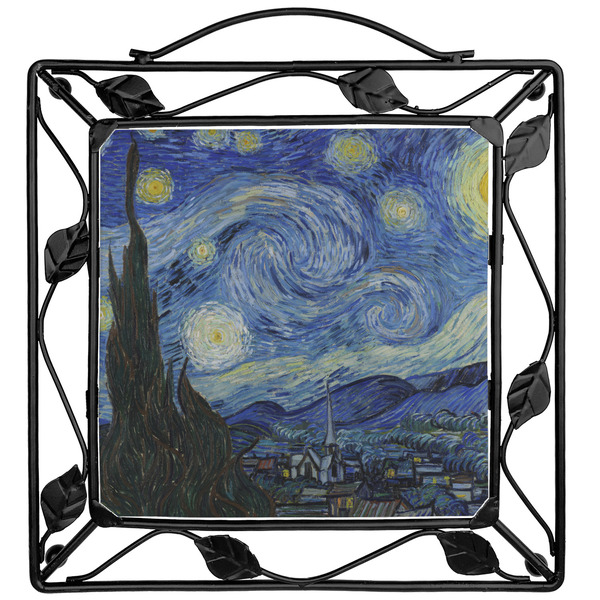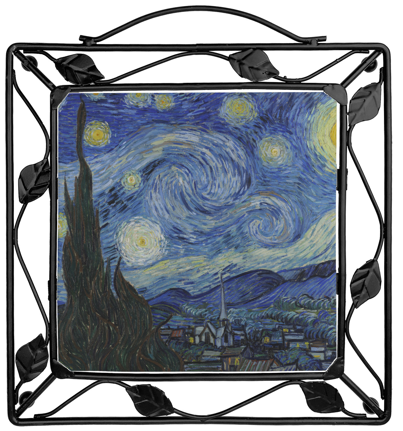 Our square trivets are made from a durable, wrought iron. This model features 4 small half circles, one on each corner, and a larger ring of iron that circles the central, customized tile. Each of the 4 corners has a round foot on its bottom for stability. This trivet is 8.75 by 8.75 inches, but the central tile measures at 6 inches on both sides.